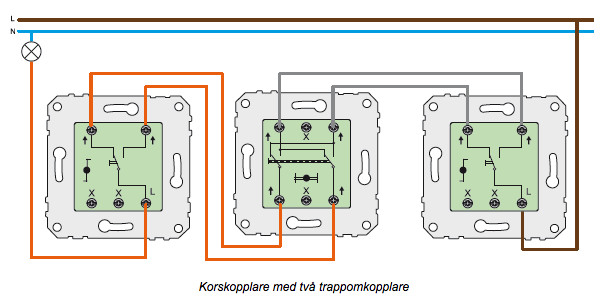 Korsomkopplar sätts då i mellan och kastar om mellantrådarna så att anslutningen av mellantrådarna blir tvärt om. Enklast att förstå är om du tänker dig fallet jag beskrivit tidigare: Båda trappbrytarna är i samma läge och strömmen går in genom L, ut genom vänstra mellantråden, kommer in genom vänstra mellantråden och går ut genom L´ till lampan. Då är korsomkopplaren i läget där mellantrådarna går rakt igenom. Om du då ändra korsomkopplaren så kastar den om trådarna. Resultatet blir nu att strömmen från den vänstra mellantråden som kommer från den matande trappbrytaren nu istället kommer in i den andra trappbrytaren på den högra mellantråden. Eftersom brytaren är i läget där den kopplar ihop den vänstra mellantråden med tändtråden så kommer inte strömmen fram och lampan slocknar.