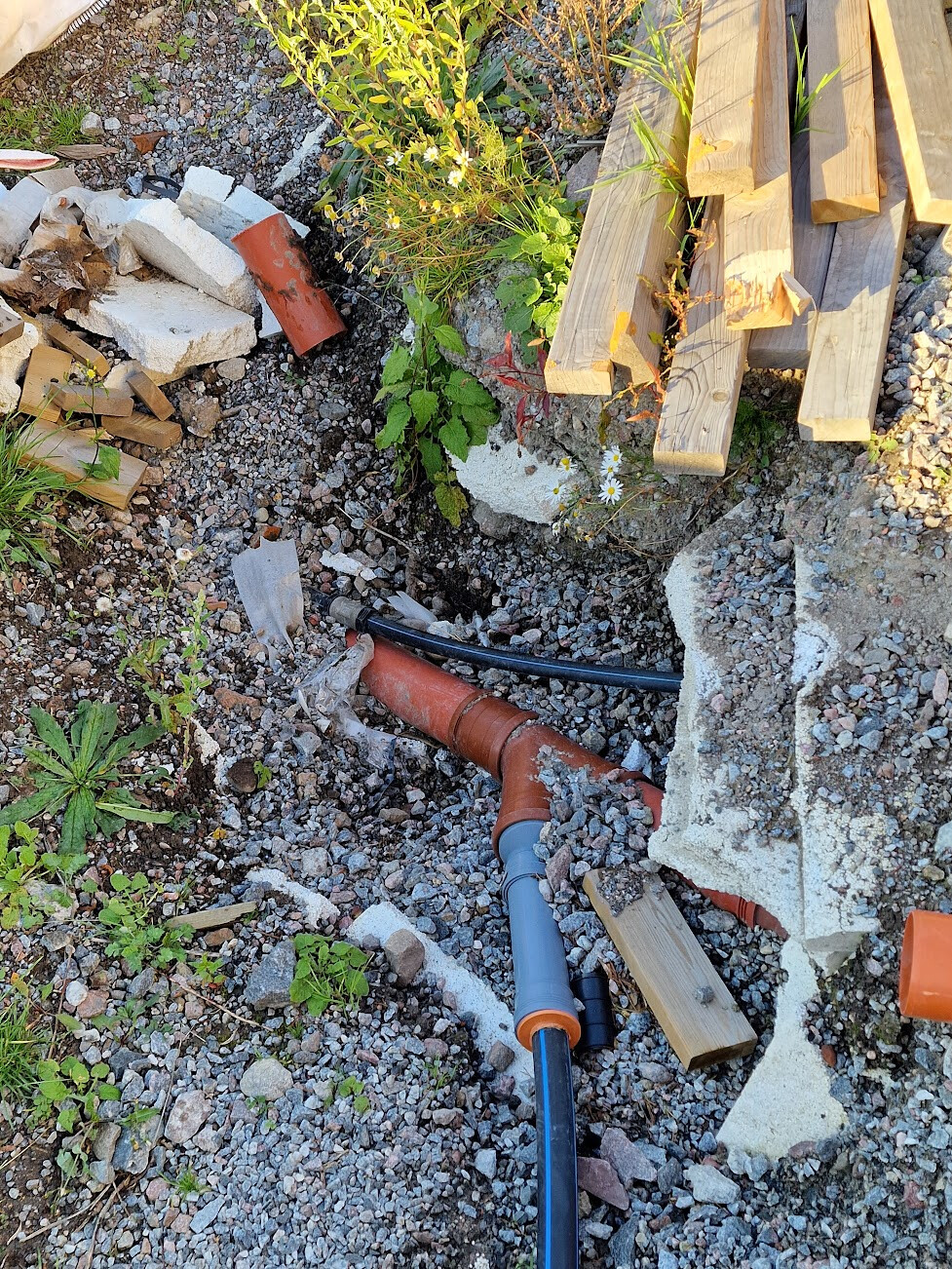 Har gjort ganska omfattande markarbete på tomten under vår och sommar. Vid ett tillfälle grävdes inkommande vatten av. Det lagades och eftersom det fortfarande var tidig vår (med kalla nätter) slängde byggarna ner lite cellplast och täckte med grus. Sedan grävdes det fram igen under sommaren.