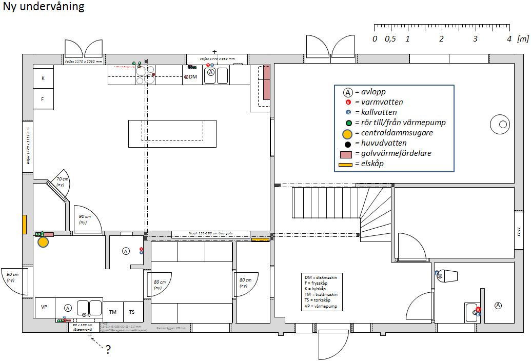 Från början hade vi tänkt oss att bara leda över alla rör till nya plattan så att de fick löpa under köksskåpen (Får inte skarvas inne i en vägg). Syns här på husmodellen: