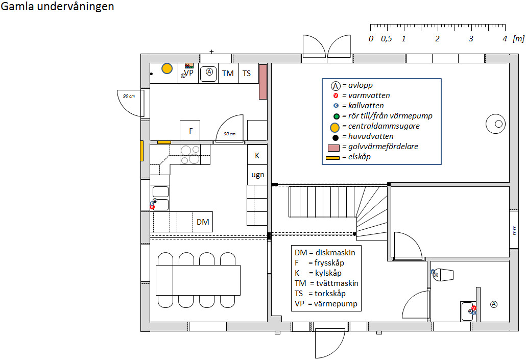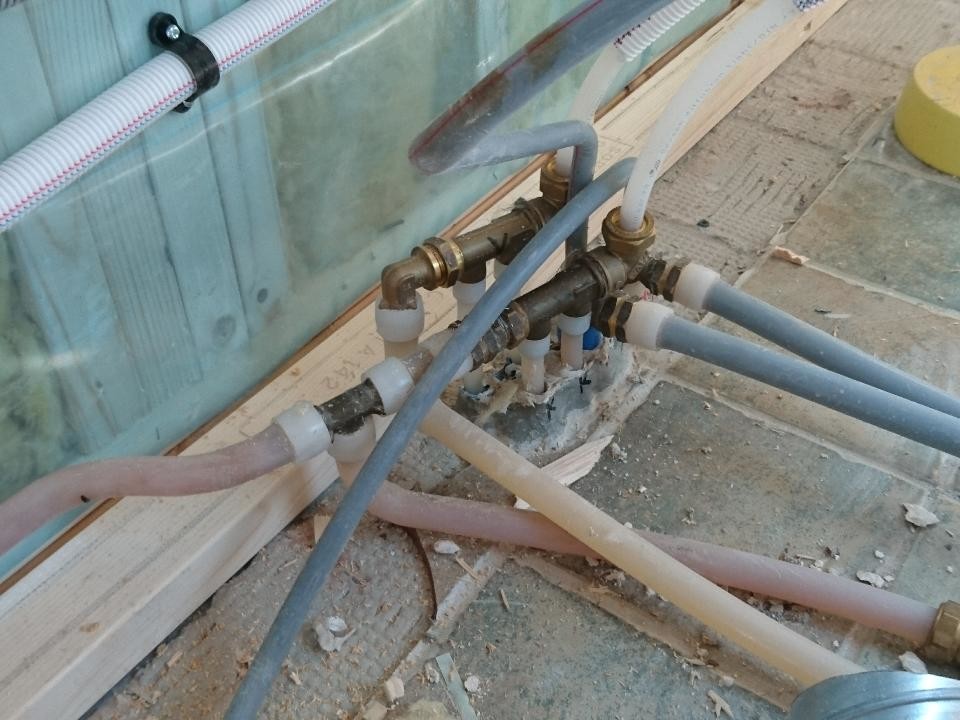 Två rör är kallvatten och två rör är varmvatten (till nedre badrummet samt gamla köksbänken som ryker) och två går till en golvvärmefördelare.