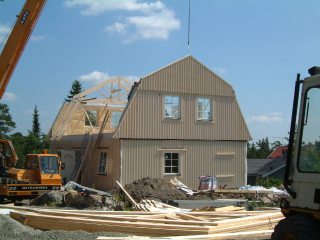 Det upptäcktes vidare när vi började riva att det saknades en takstol ytterst på husets kortsidor. I efterhand också helt naturligt eftersom övervåningen och vinden bestod av två separata moduler ställda på varandra som förstås inte kunde ha en gemensam takstol. Här är en bild från när vi byggde 2002 där det syns att man ställer vindsdelen ovanpå övervåningsdelen: