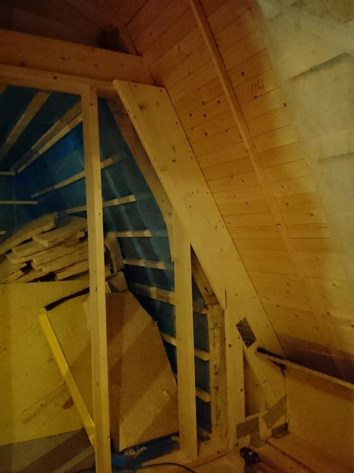 Våra byggare platsbyggde en takstol, m.h.a konstruktionsritningar från leverantören (Derome). På bilden nedan syns det att det saknas en takstol ytterst. Men som sagt byggdes en dito på plats: