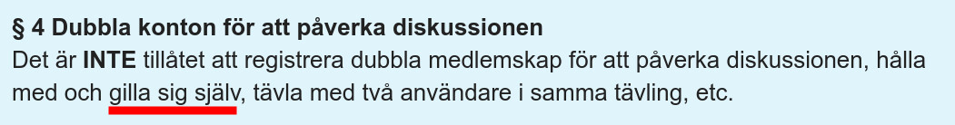Men visst, läser man regeln ovan bokstavligt öppnar den kanske upp för att det i vissa fall är OK med dubbla medlemskap, men jag tror ändå den naturliga tolkningen för de flesta är att en fysisk person enbart får ha ett konto. Men som sagt, ingen stor sak för mig och härmed färdigkommenterat från min sida.