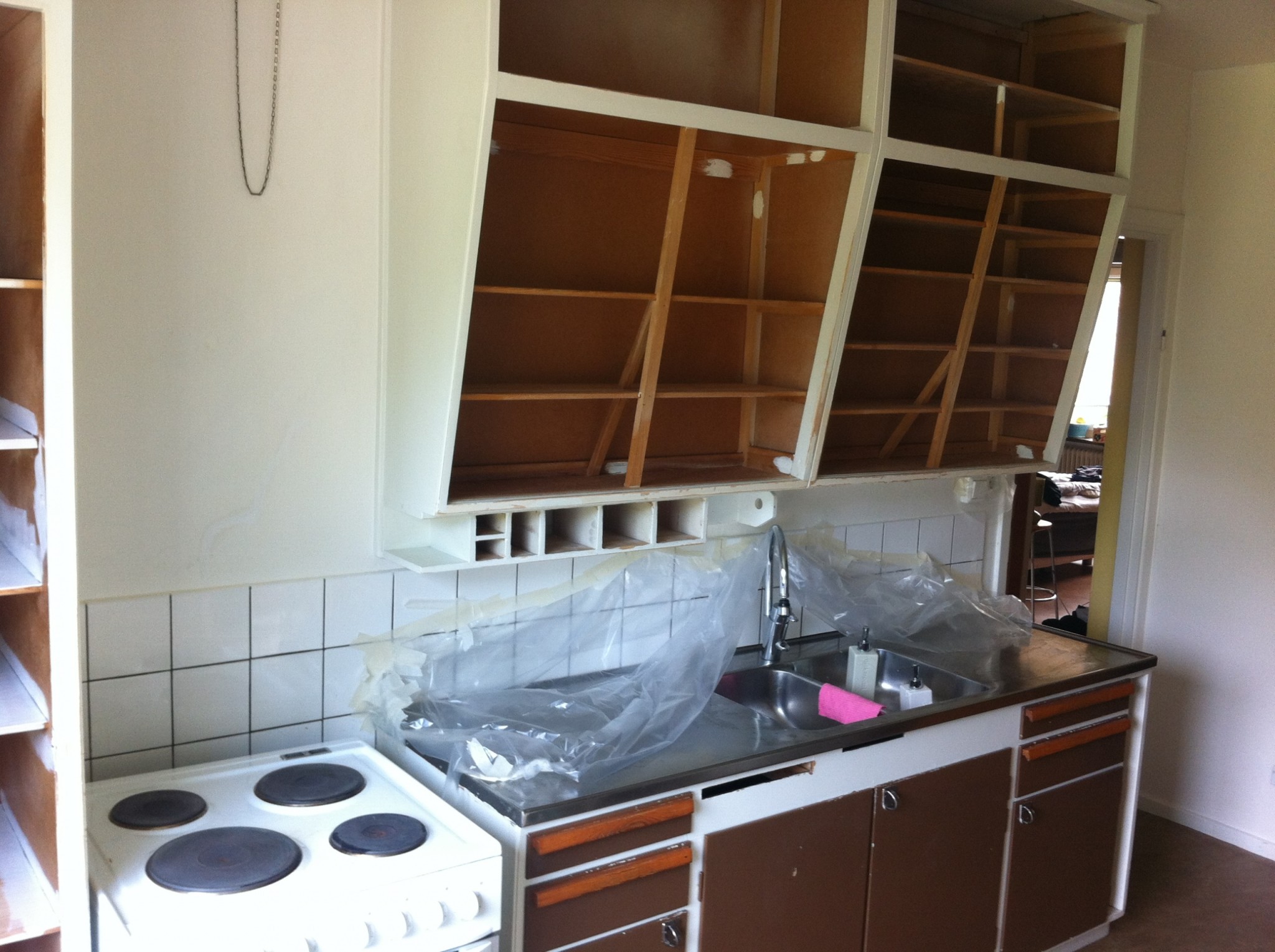Höja diskbänken, förlänga rör till blandaren, dra el för diskmaskin, dra el för köksfläkt, kakla väggen ända upp i taket, lägga golv.