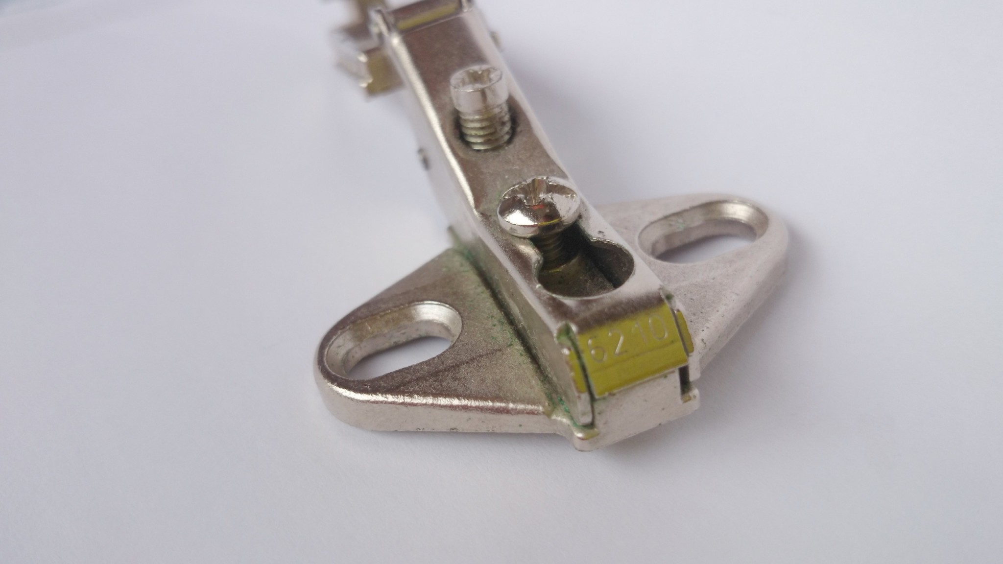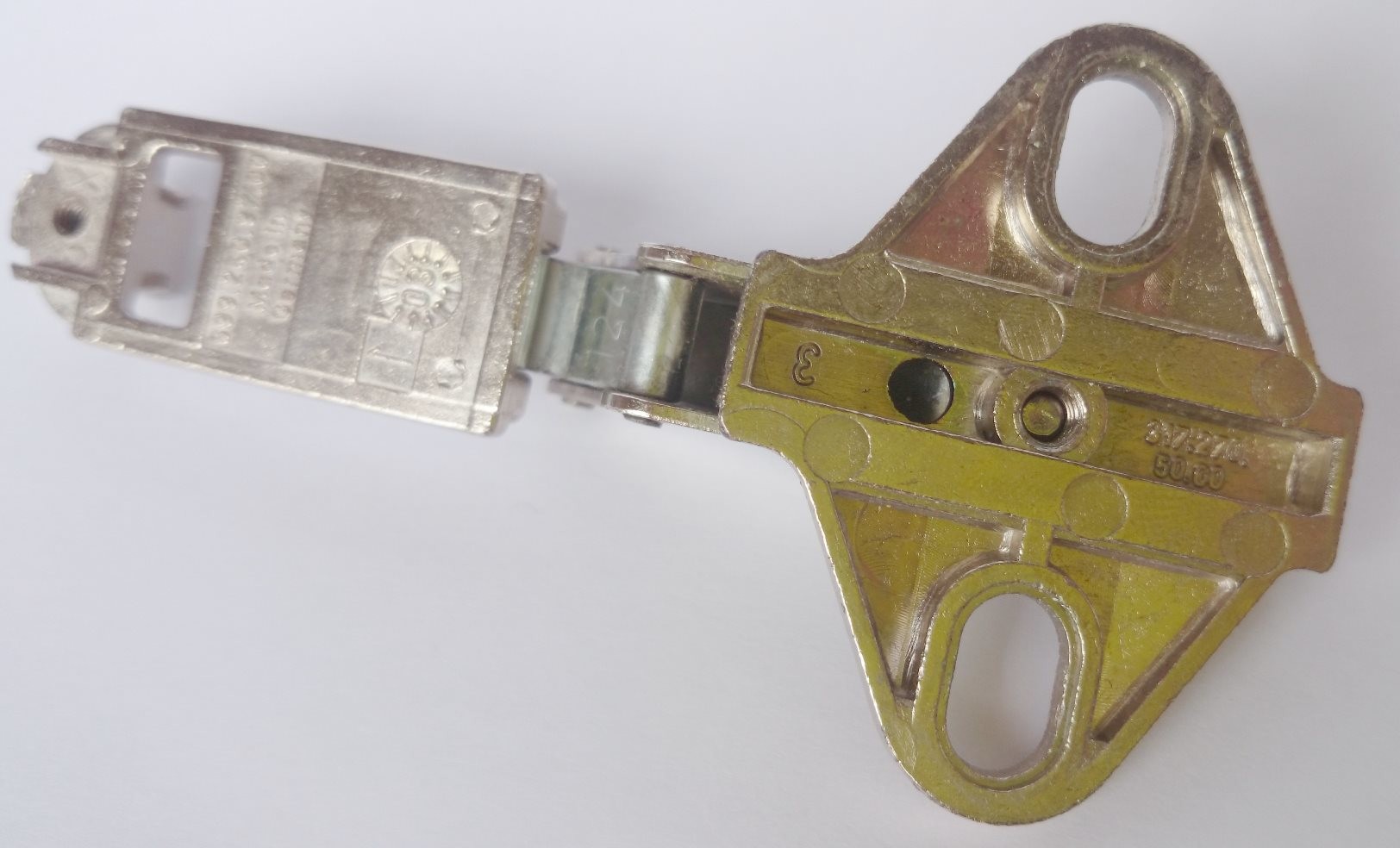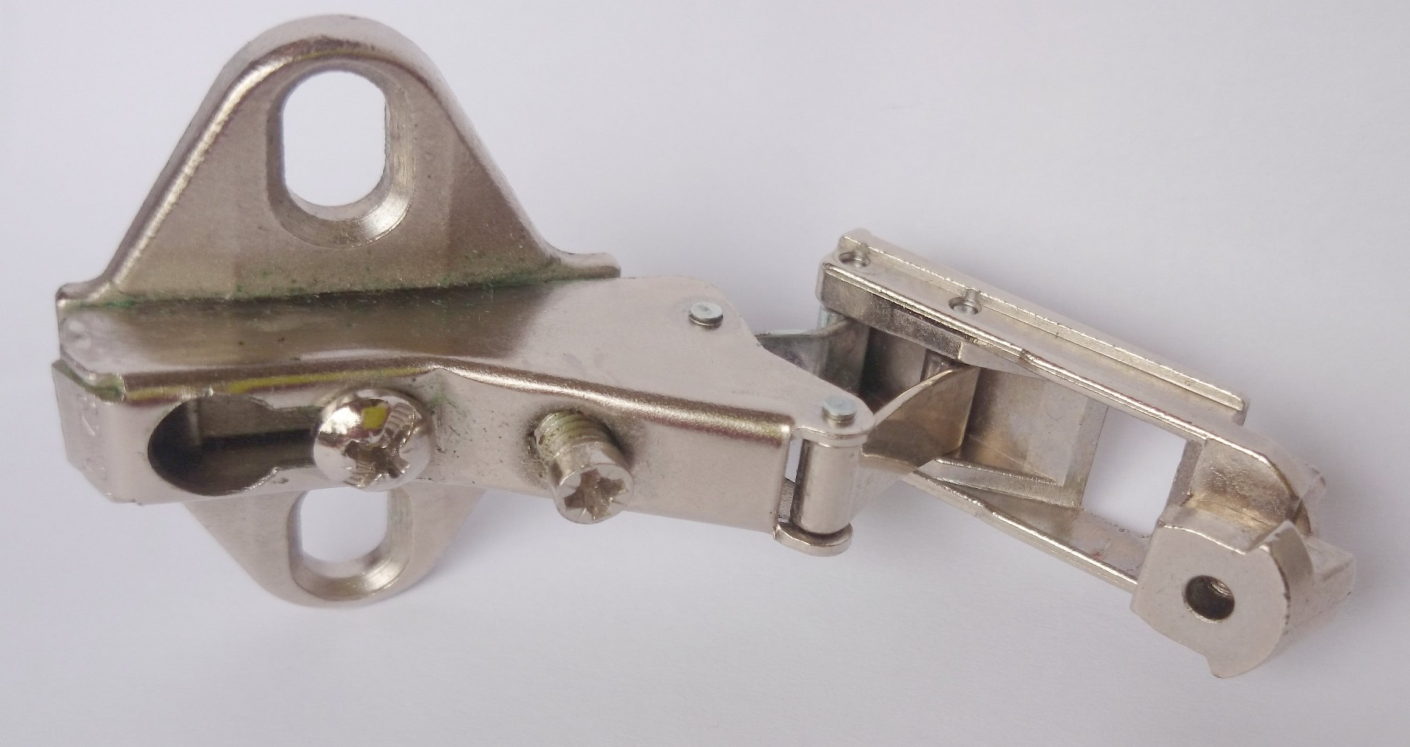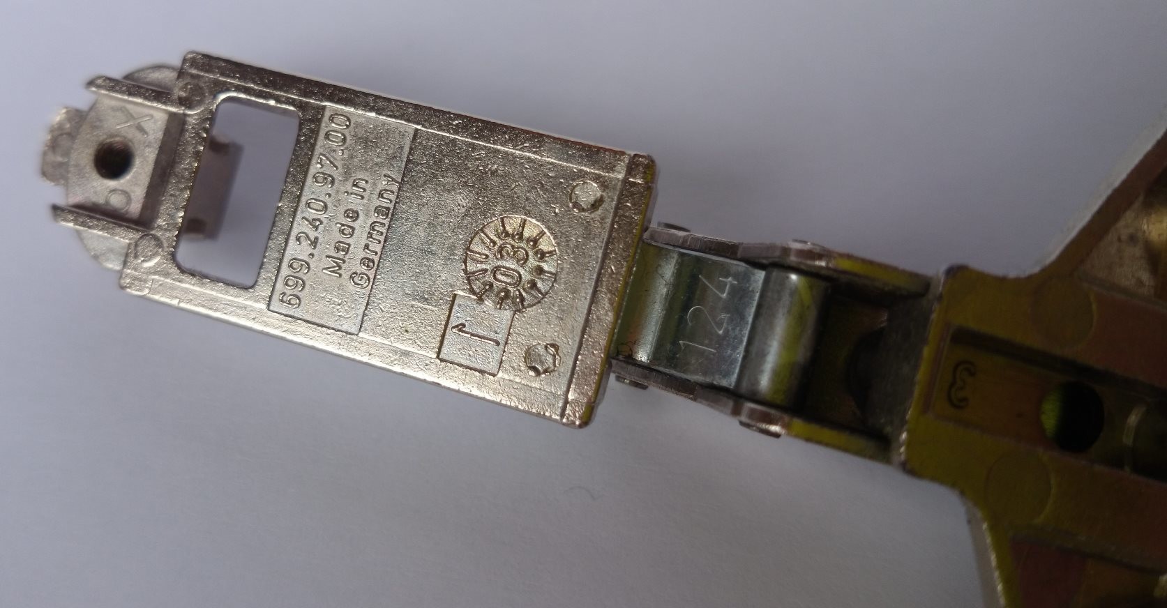 Jag skulle behöva hjälp att identifiera ett gångjärn till ett badrumsskåp. Badrumsskåpet har suttit monterat i mitt badrum sen innan jag flyttade in, och jag skulle gissa att det är från mellan 2004 och 2007.