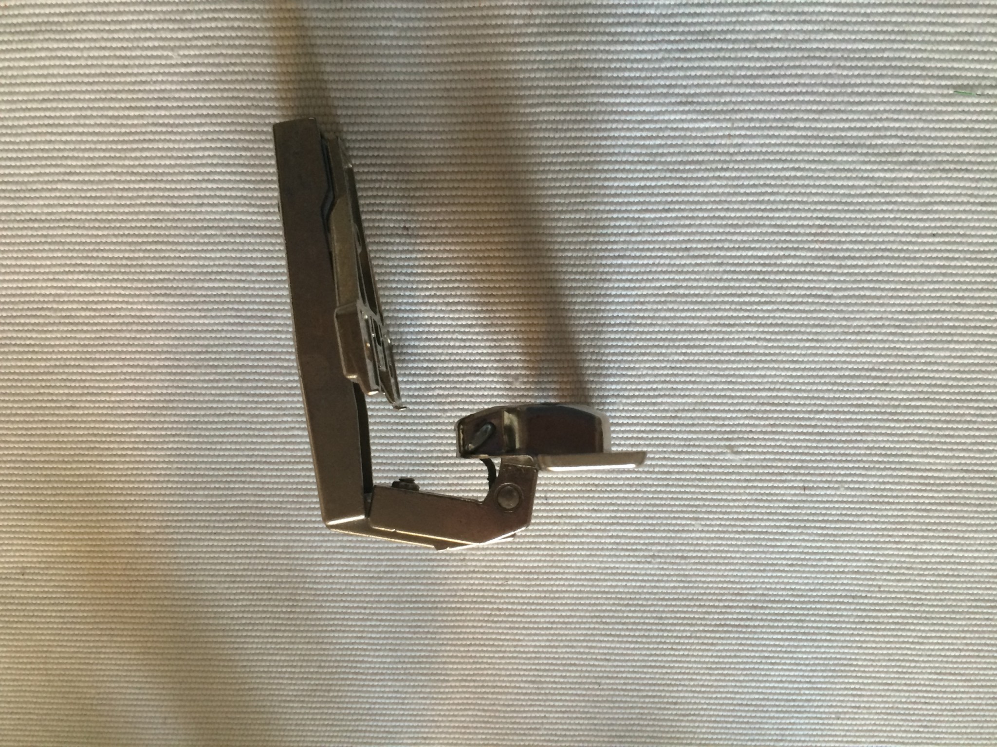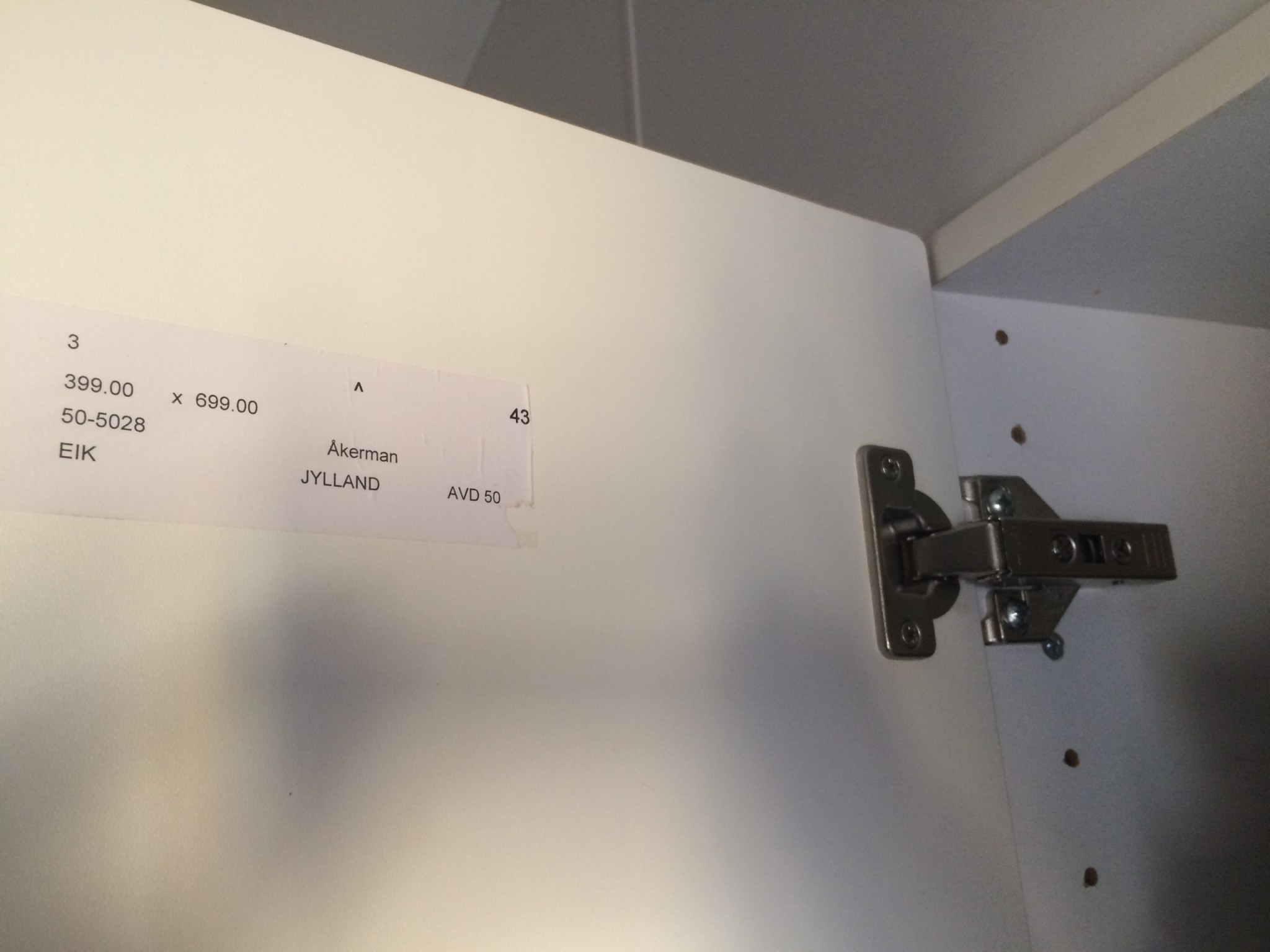 Har ett trasigt vinkelgångjärn i ett gammalt kök. Gångjärnet är av märke Hettich.