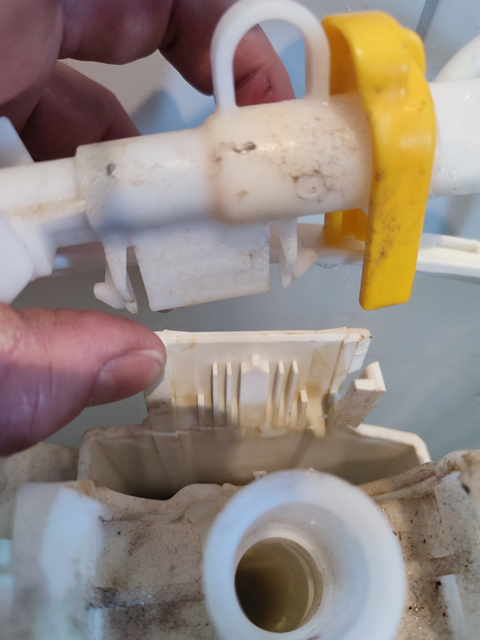 Den här platsbiten hade spruckit på min IFÖ vilket ledde till att vinkeln på vattenstrålen som fyller tanken ändrades vilket i sin tur medförde att de stänkte vatten som hamnade utanför tanken och ner på golvet.