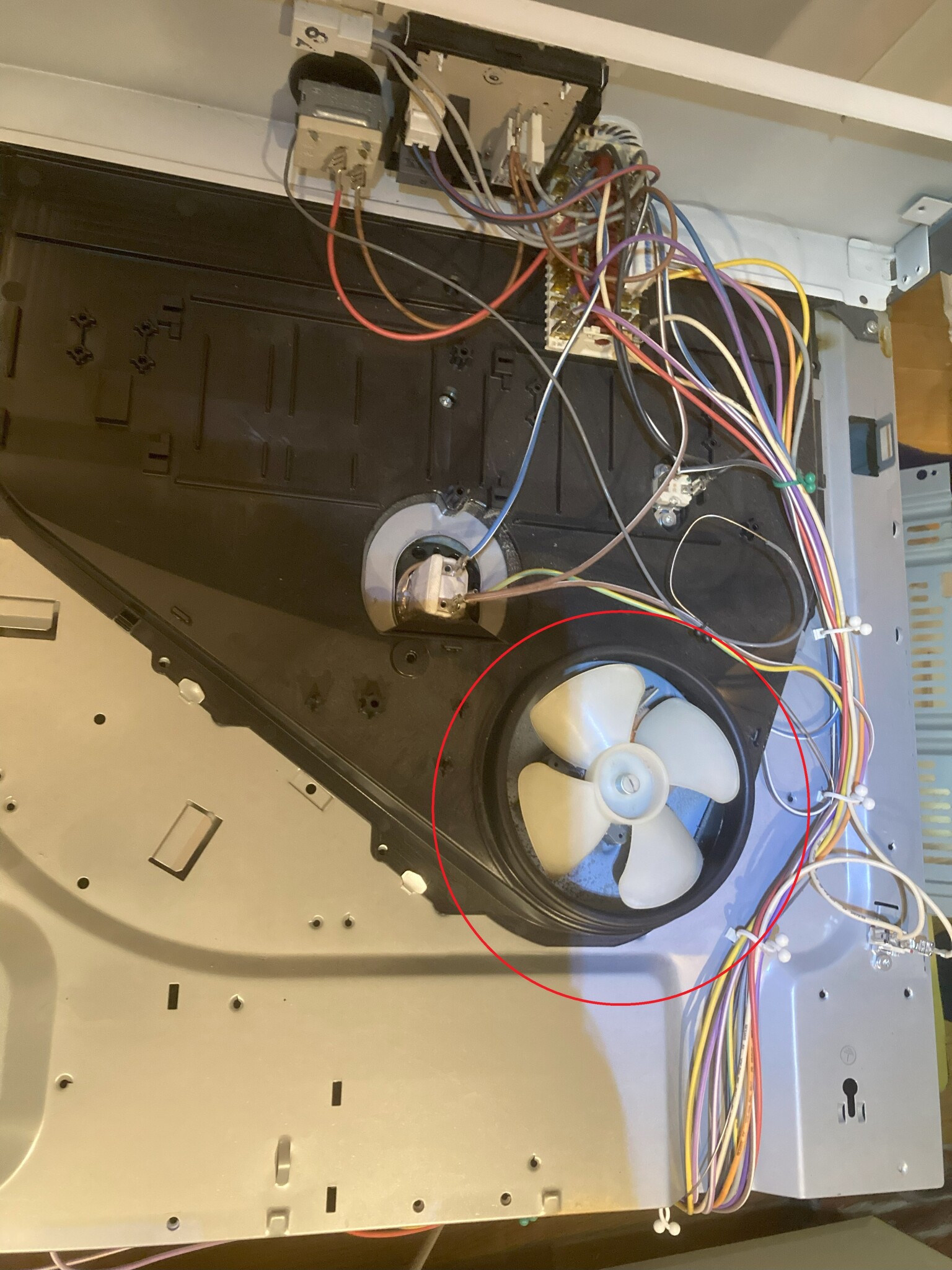 Problemet är att ugnen är i princip helt död. Displayen fungerar och den lilla fläkten inringad med rött snurrar när man sätter på ugnen men i övrigt är ugnen helt död, inte ens fläkten för varmluftsfunktionen snurrar.