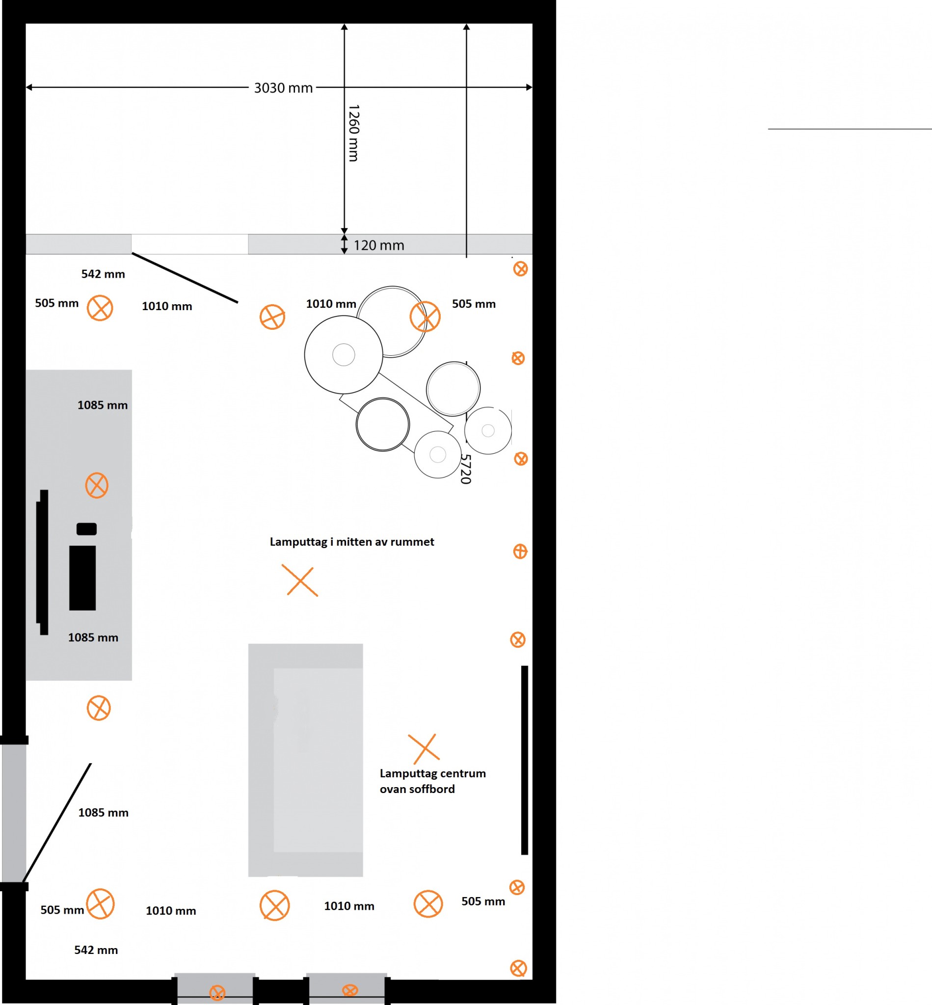 Här kommer ett belysningsförslag från mig! Jag har skippat att göra en stjärnhimmel av spottar utan istället gjort en "hästsko" av spottar som följer väggarna, små spottar som skapar släpljus på väggen TV:n sitter på som sedan går att dimra ner och skapa en behaglig upplyst vägg bredvid TV:n för att minska ner kontrasten, samt små spottar i de bägge fönstren och sist, men absolut inte minst - lamputtag i mitten av rummet och över soffbordet för en hängande taklampa.