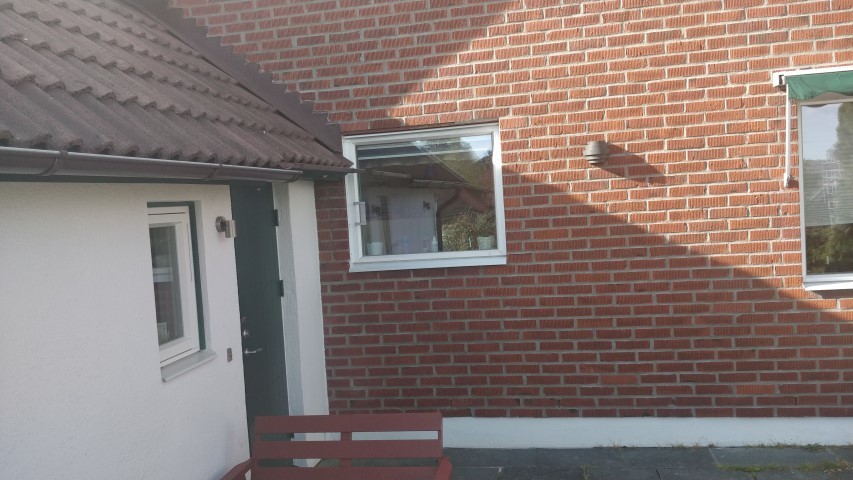 Se bild på problemet nedan (kass mobilbild, svårt att fota när solen skiner). Infästningen i tegelväggen skulle alltså börja något till vänster om lilla fönstret och sluta ovanför det stora fönstret till höger i bilden. Taket till vänster är där jag skulle behöva lägga upp ena hörnet (det skall vara ett visst fall mot fotot för avv vattnet skall rinna av, duken skall dras vänster->höger)