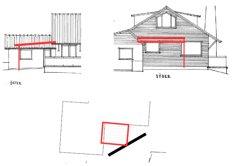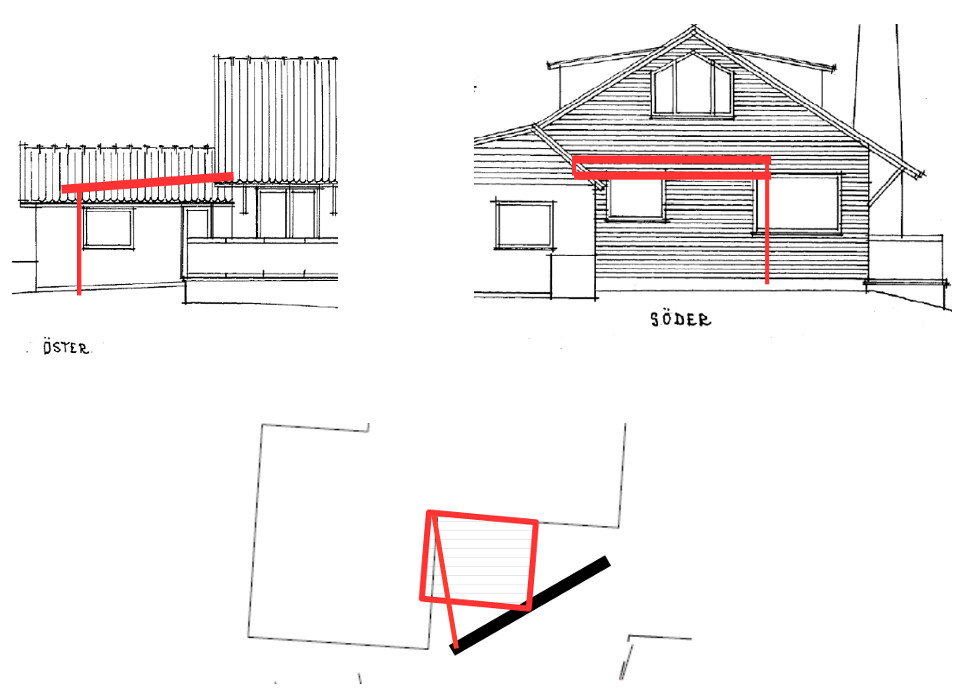 Ena gaveln får jag fästa i fasaden (skaltegelmur) och en stolpe vår stå fritt på muren som ringar in uteplatsen. Problemet är sista hörnet eftersom garageväggen är andra väggen av vilkeln och taketutskjutet/hängrännan slutar ¨~2m över marken. Jag kan alltså inte fästa i väggen för då blir pergolan för låg. Alltså hade det varit smidigt att skicka upp allt en bit på taket (~40grader takvinkel).