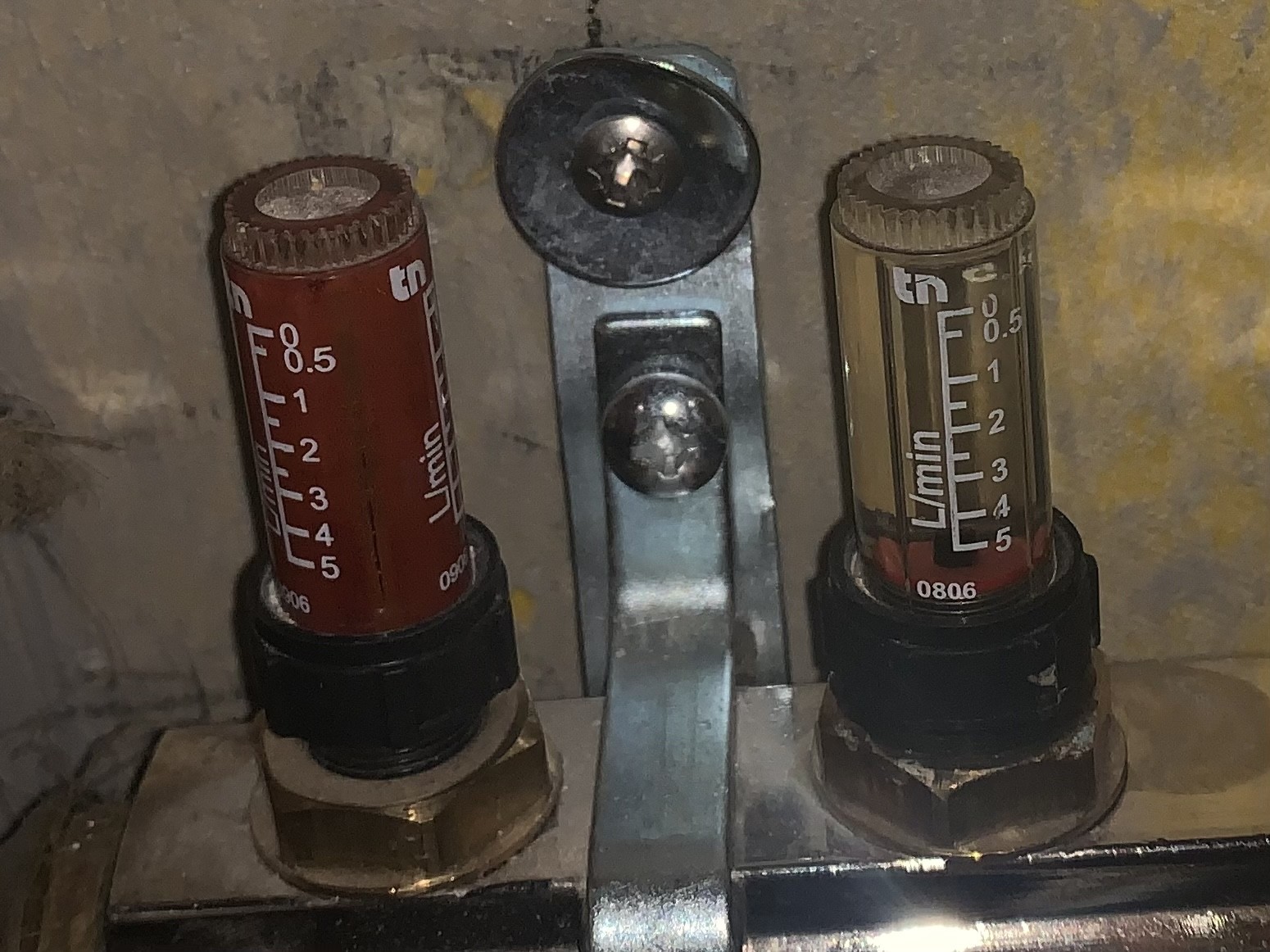 Men jag undrar också varför den ena flödesmätaren är helt röd? De andra är ju genomskinliga med en röd ring som åker upp eller ner beroende på flöde.