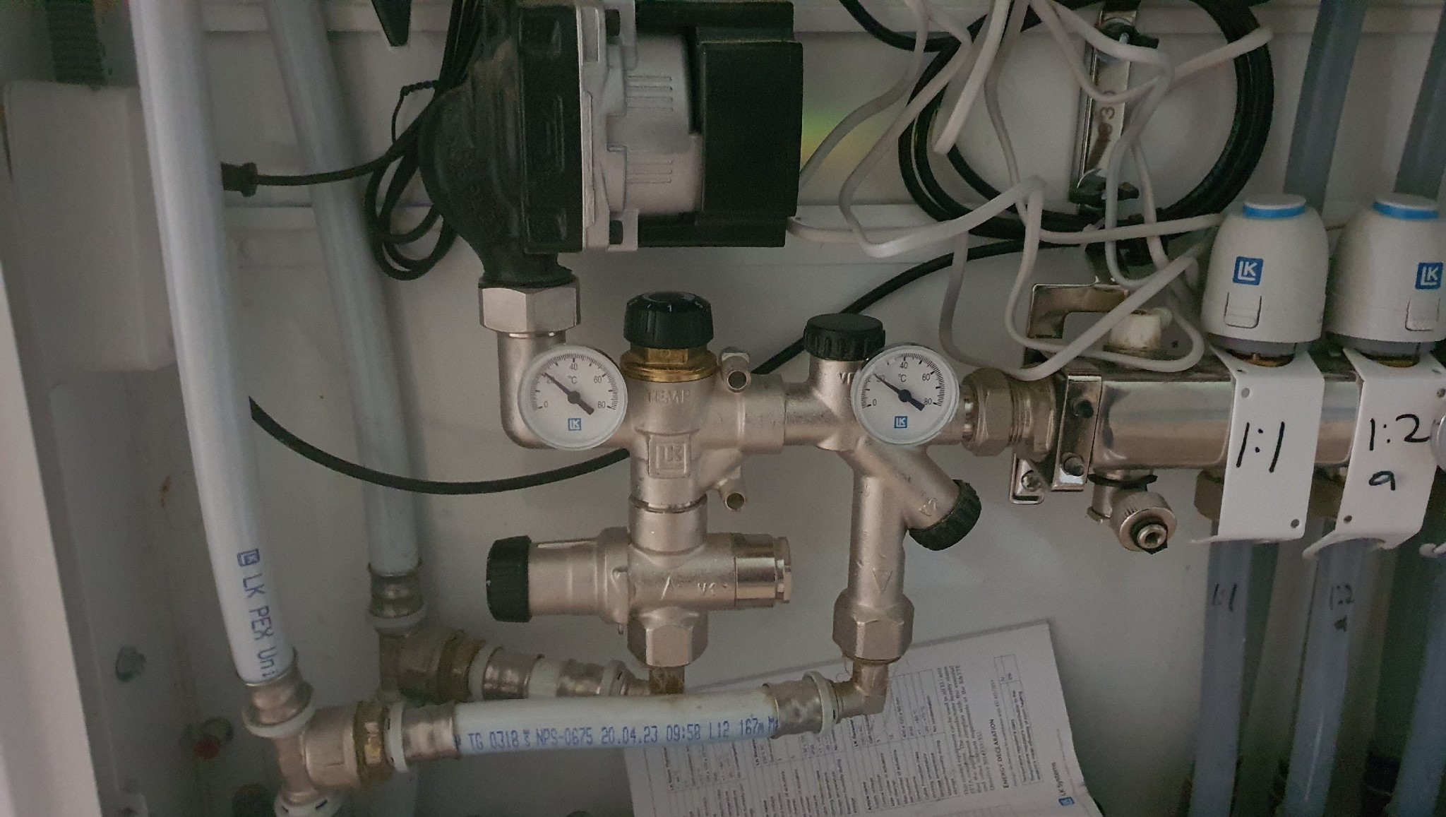 Bild 2 under pumpen, har du ett vred som du styr framtempen till golvvärmen. Prova att se om du får upp värmen på elementen på övervåningen om du vrider ner tempen till GV. Misstänker att der står fullt öppet och att huvudpumpen då inte ger tillräckligt tryck till både gv och element, när plattan är nerkyld.