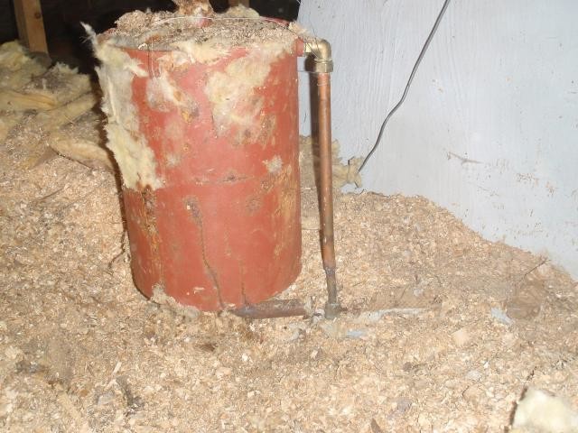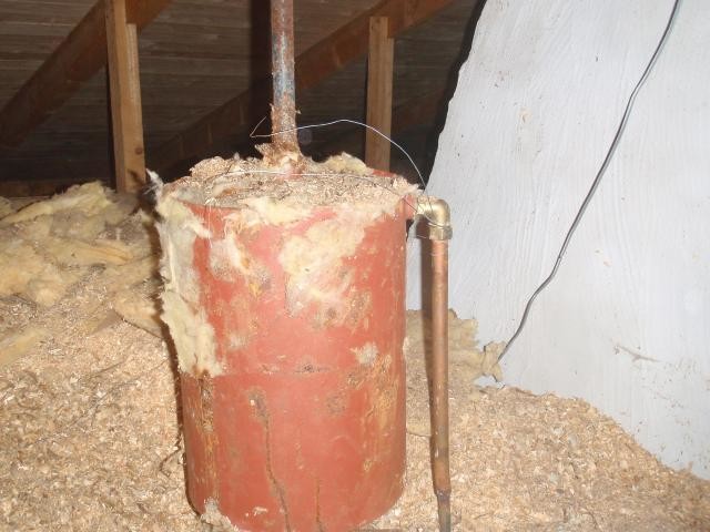 Mitt expansionskärl på vinden såg inte riktigt ut såhär... jag är själv helt pinfärsk vad gäller hus och allt därtill men vad jag har förstått så om man har ett öppet system såsom det är med ett expansionskärl på vinden så ska det finnas en svanhals genom taket. Det verkar som du inte har ett sådant???