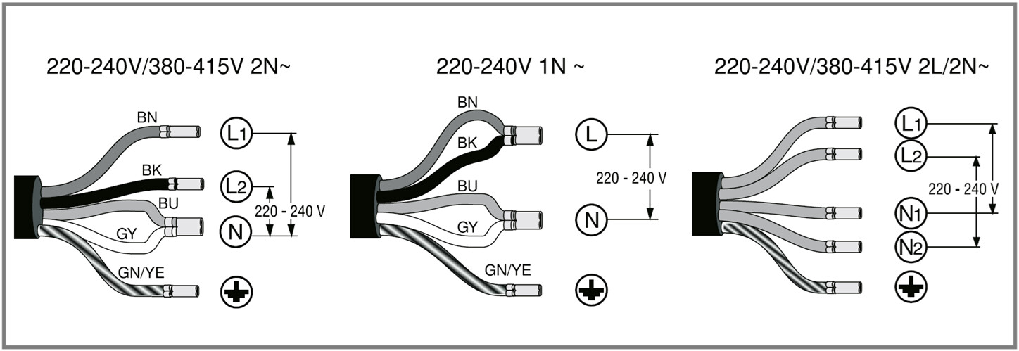 Det gäller en induktionshäll med tre olika medlevererade kablar, det är 2-fasanslutning som är aktuell i vårt fall.