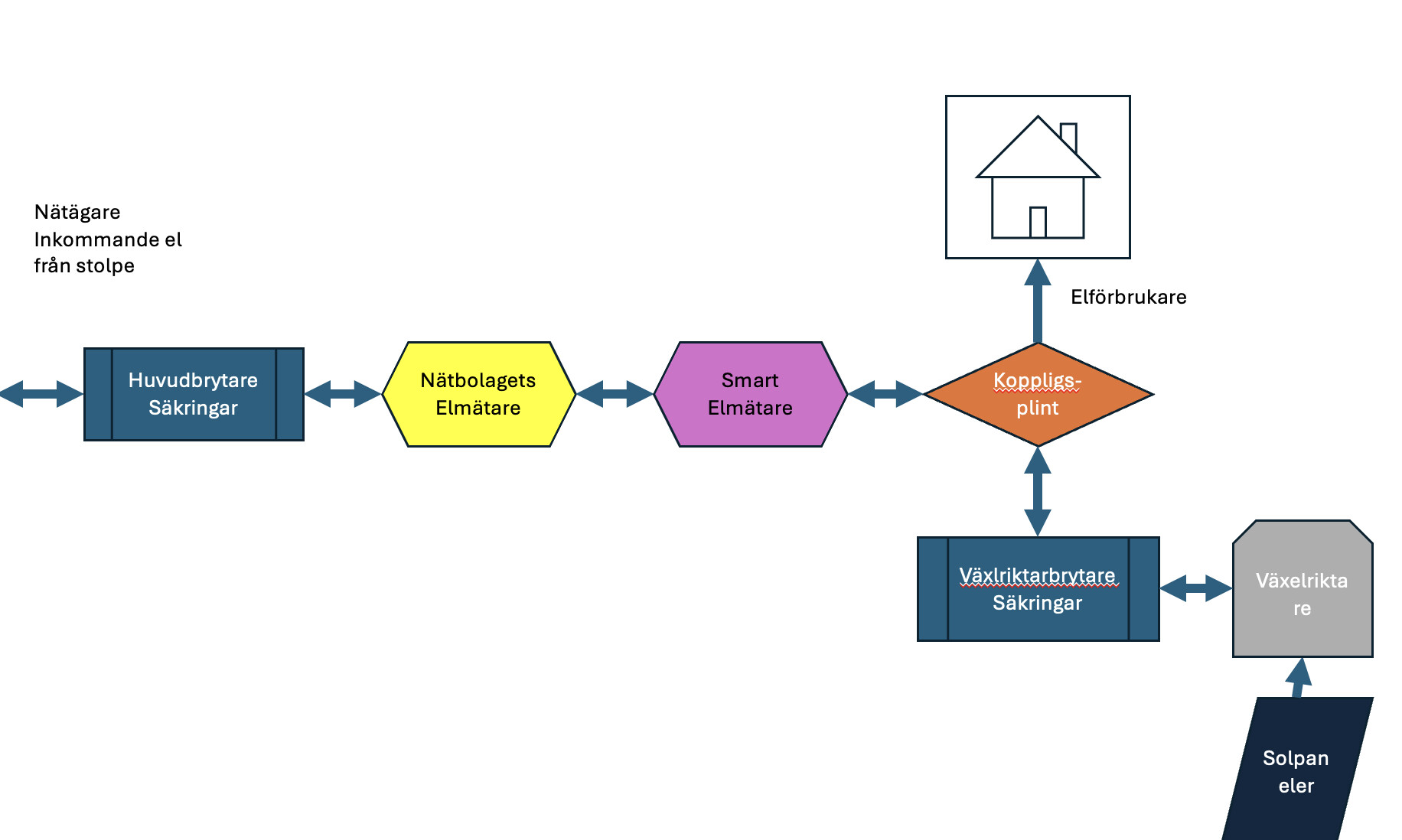Från Nätägarens elmätare in till Smarta elmätaren direkt och därefter till Kopplingsplinten(förbrukare & produktion).