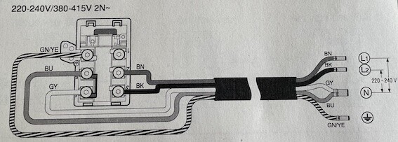 Tänker man till och även kollar bilden över hur de vill att man ska koppla in den medföljande kabeln, så ser man att de vill (enligt min tolkning) att man ska koppla både den gråa samt blåa mot nollan i eluttaget och sen dessa till N stiften (4 och 5).