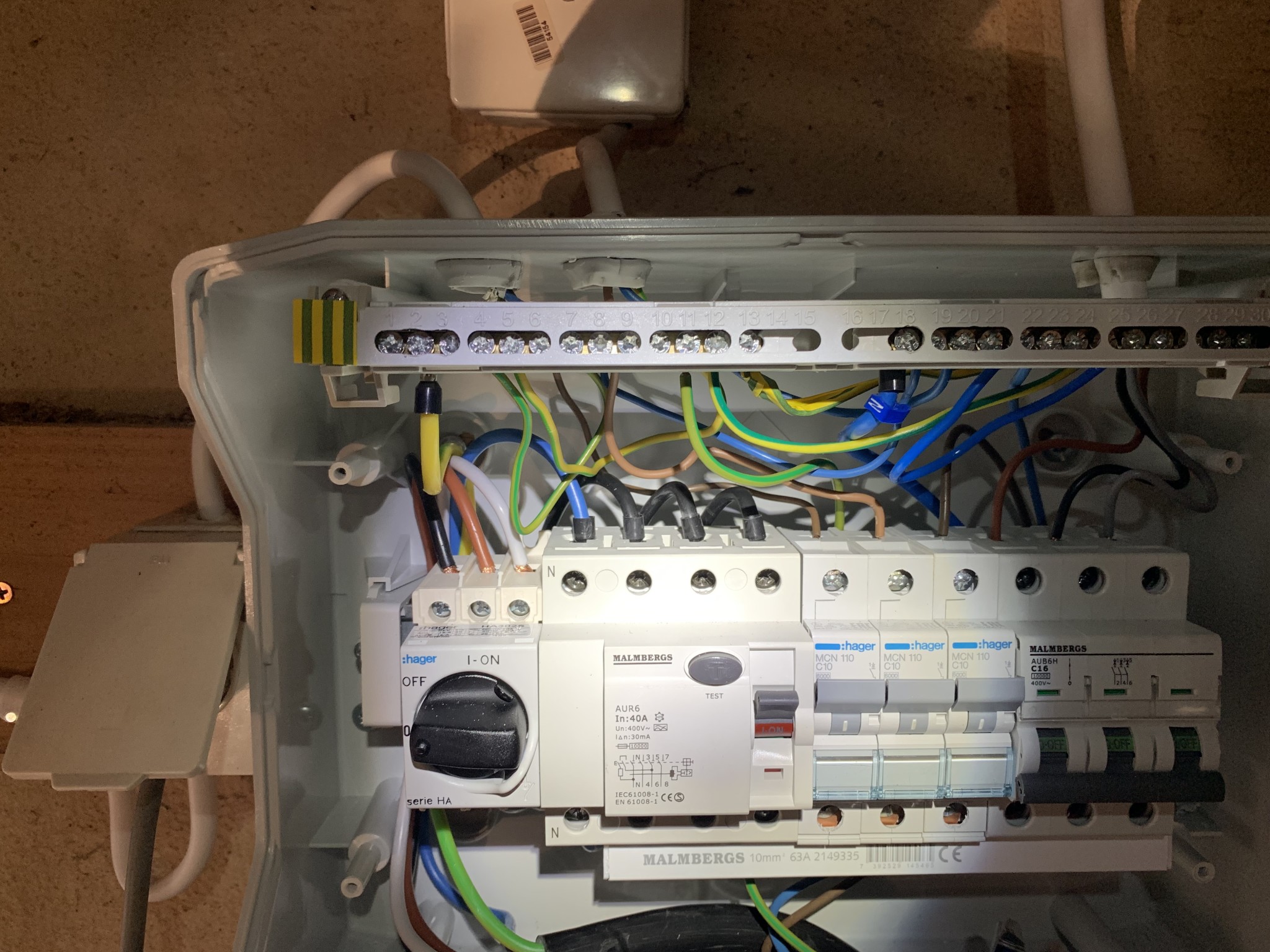 Den gul/gröna ledaren till garaget är en PE-ledare, och ansluts där till en jordskena (PE-skena)