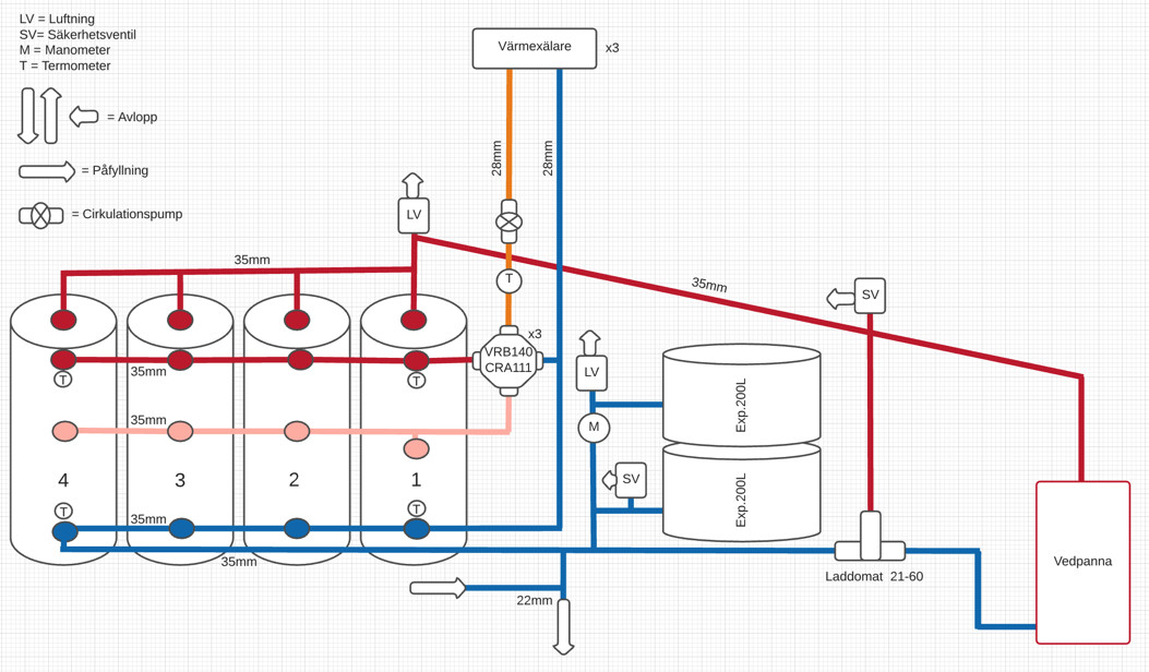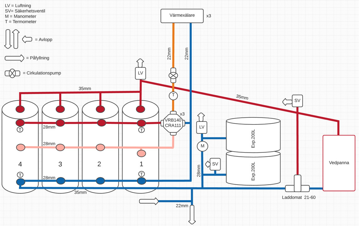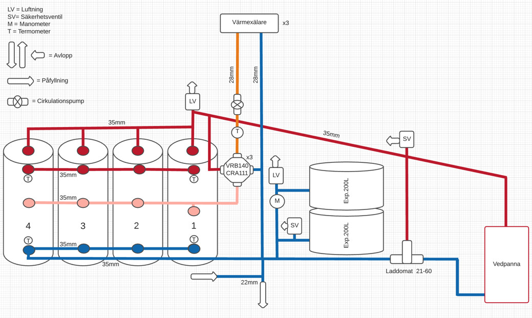 Åter igen mycket bra feedback! jag har uppdaterat ritningen med bådas input, värmen tas nu från toppen, lämnar röd koppling mellan tankarna för bättre spridning av värmen mellan tankarna enligt länkad pdf. Sen var det en mycket bra poäng med att flytta returen från växlarna till den bortre tanken, irriterande att jag inte tänkt på den själv