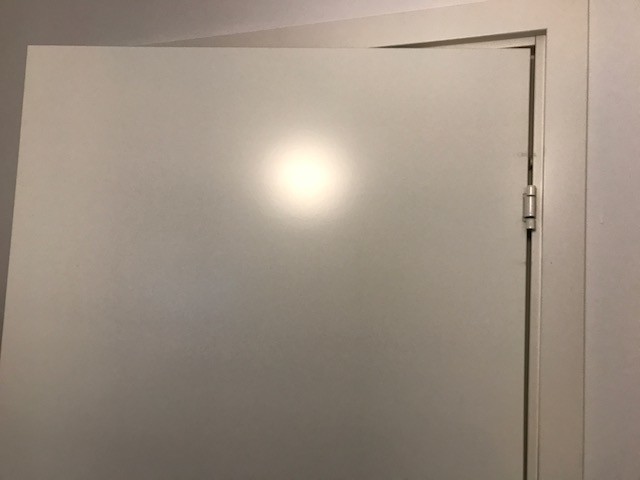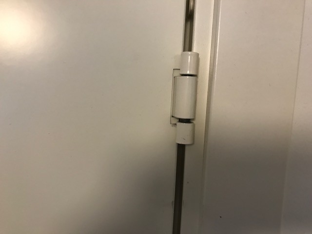 En innerdörr hänger något åt handtagshållet till vänster vilket kanske är orsaken till att den självöppnas helt och hållet om jag försöker låta den vara halvöppen. Gångjärnen till höger, ett uppe och ett nere, är av den typ som justeras med två sexkantskruvar, en överst på gångjärnen och en underst på gångjärnet.Jag blir inte klok hur jag ska skruva för att dörren ska räta upp sig.