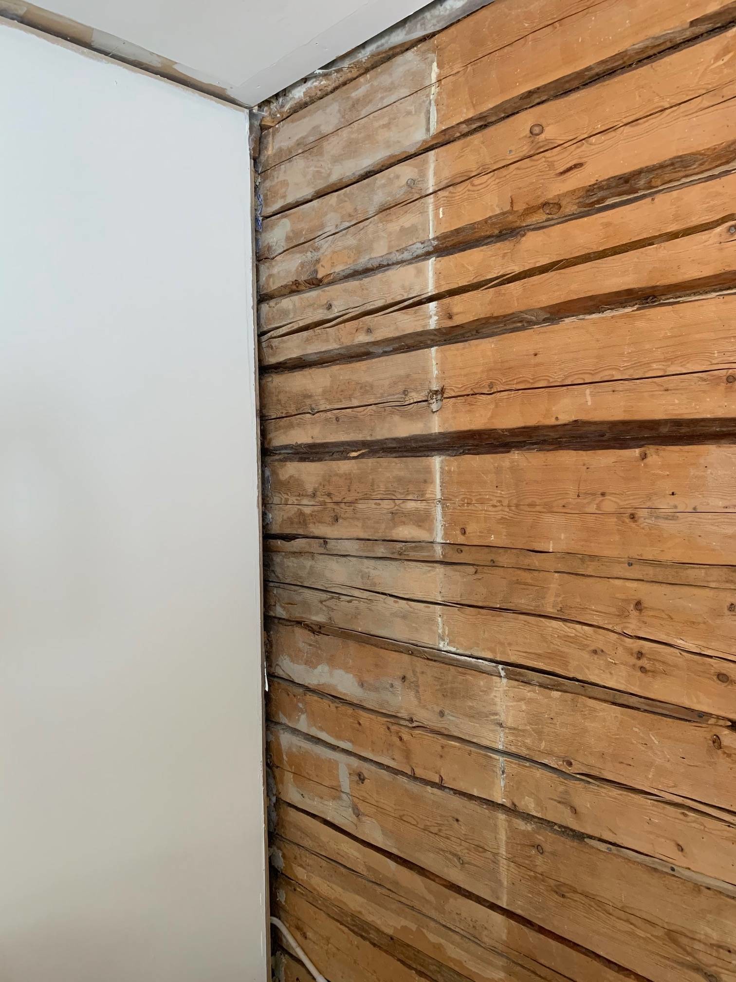 Vi har tagit fram en timmervägg (innervägg) i salen som ska få vara frilagd, övriga väggar (ytterväggar) är isolerade utifrån och på insidan sitter reglar - byggplast - gips.