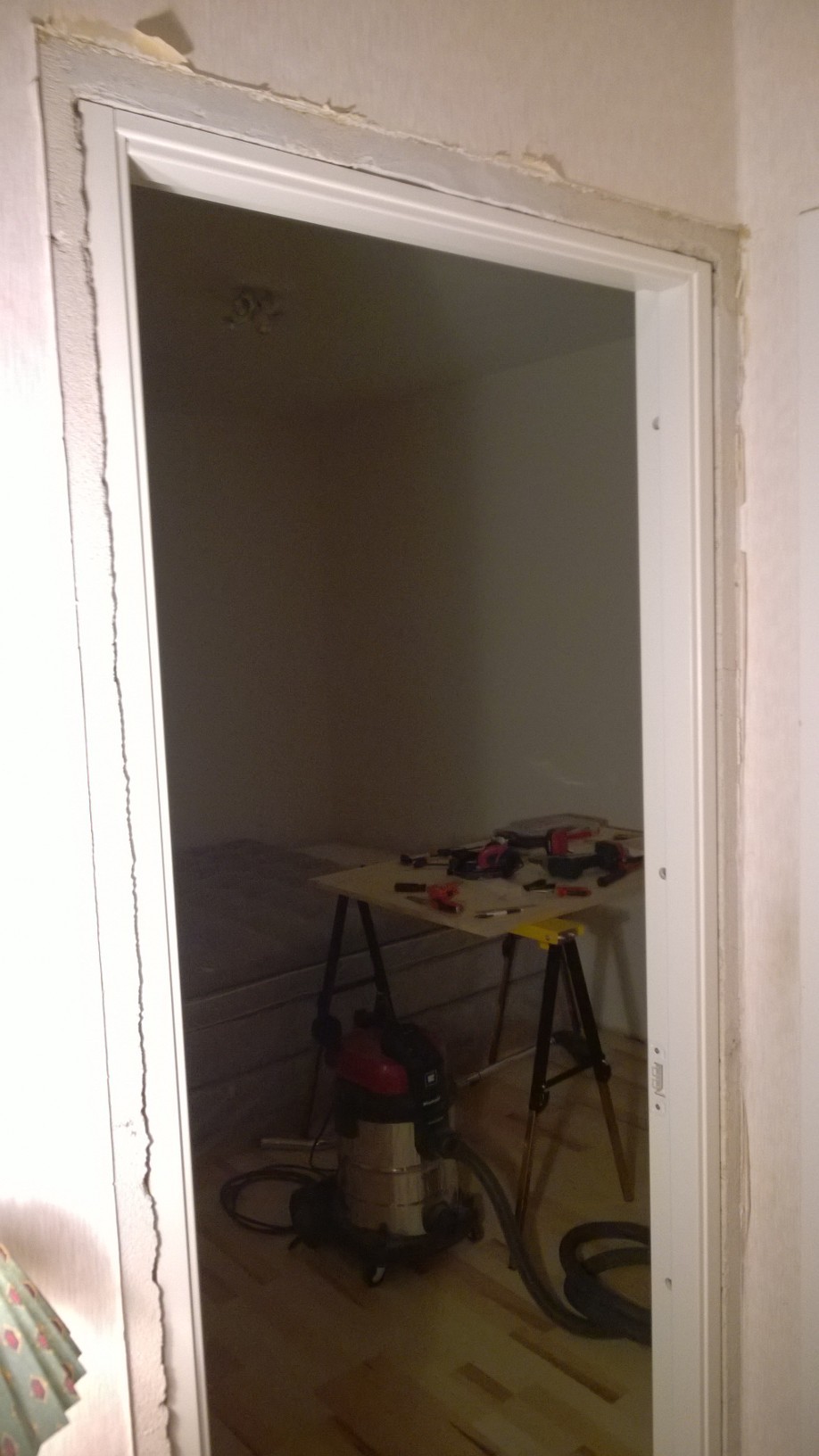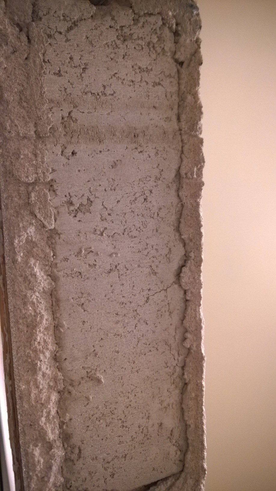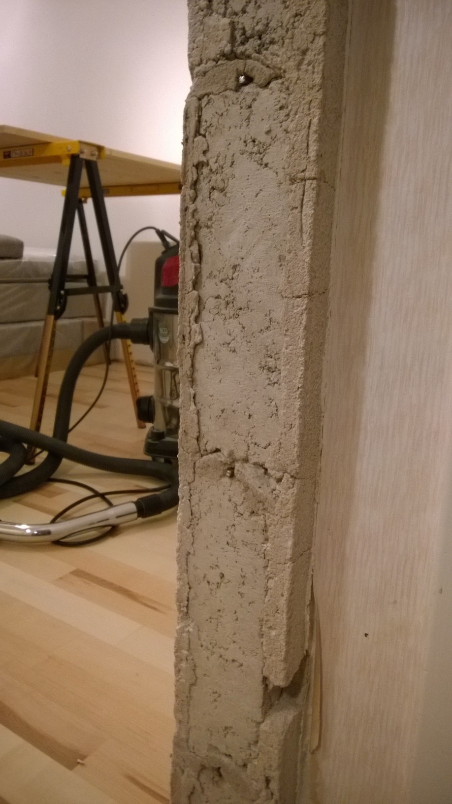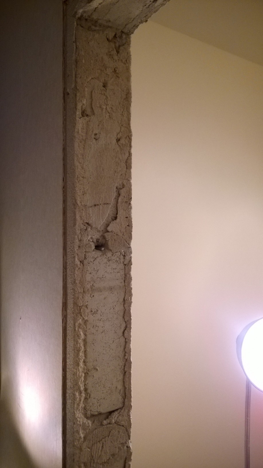 Har precis rivit bort en av dörrkarmarna i vår lägenhet byggd 1950. Funderar nu på vilken skruv jag ska använda för att fästa karmhylsorna till den nya karmen och valet står mellan betongskruv och lättbetongskruv (dvs. varianterna som inte behöver plugg). BIfogar bilder på hur väggen ser ut.