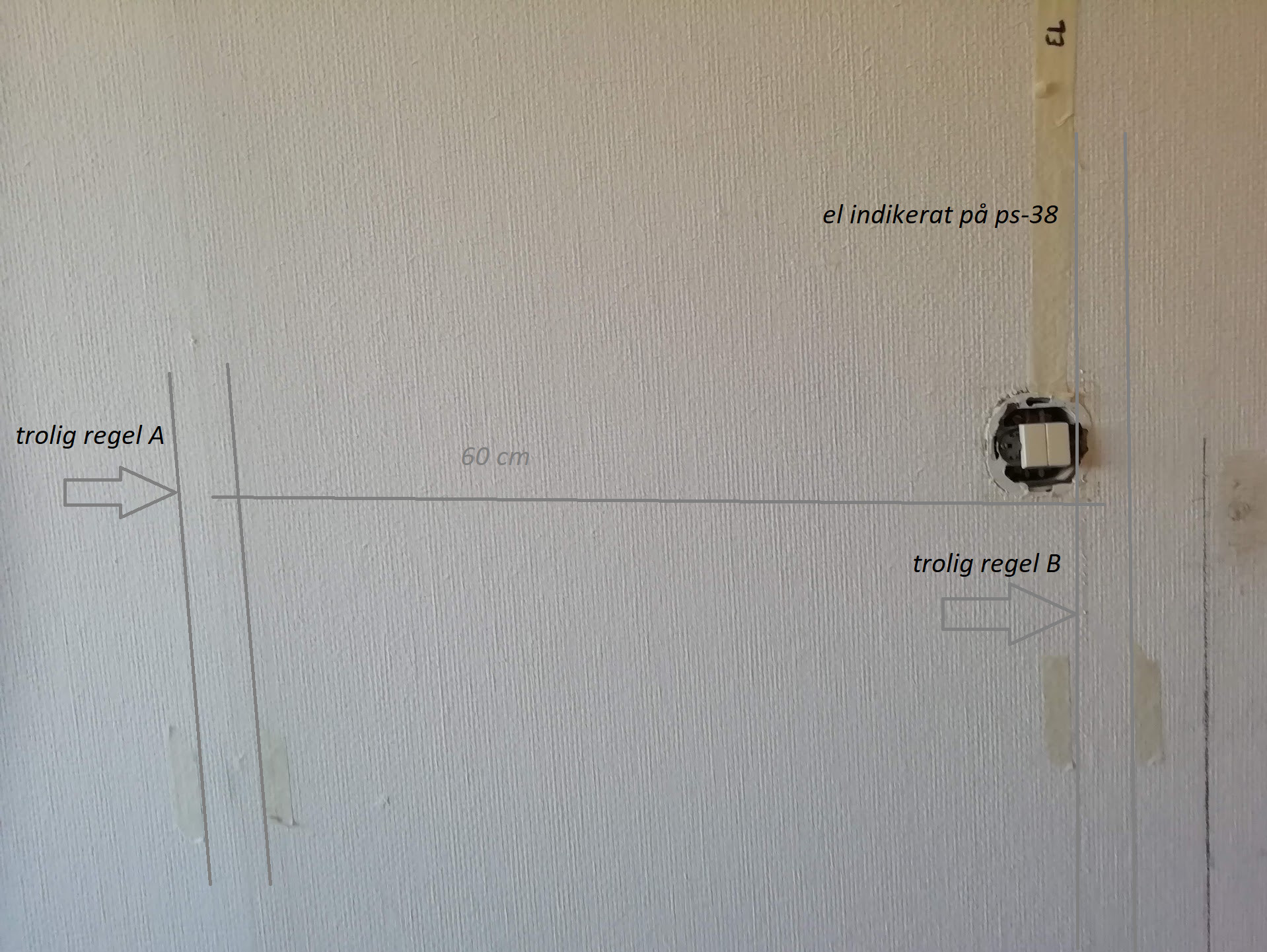 noob-fråga: behöver spika upp en innervägg (tillfälligt under renovering), men blir lite osäker med tanke på el-dragning.. har hittat två reglar i en gavelyttervägg, som jag tänkt fästa lodrät regel i, men har fått indikering på el med en byggscanner (ps-38). Indikeringen är inte klockren, och motsvarande problem på andra väggen (bakom mig sett från hur fotot är taget).