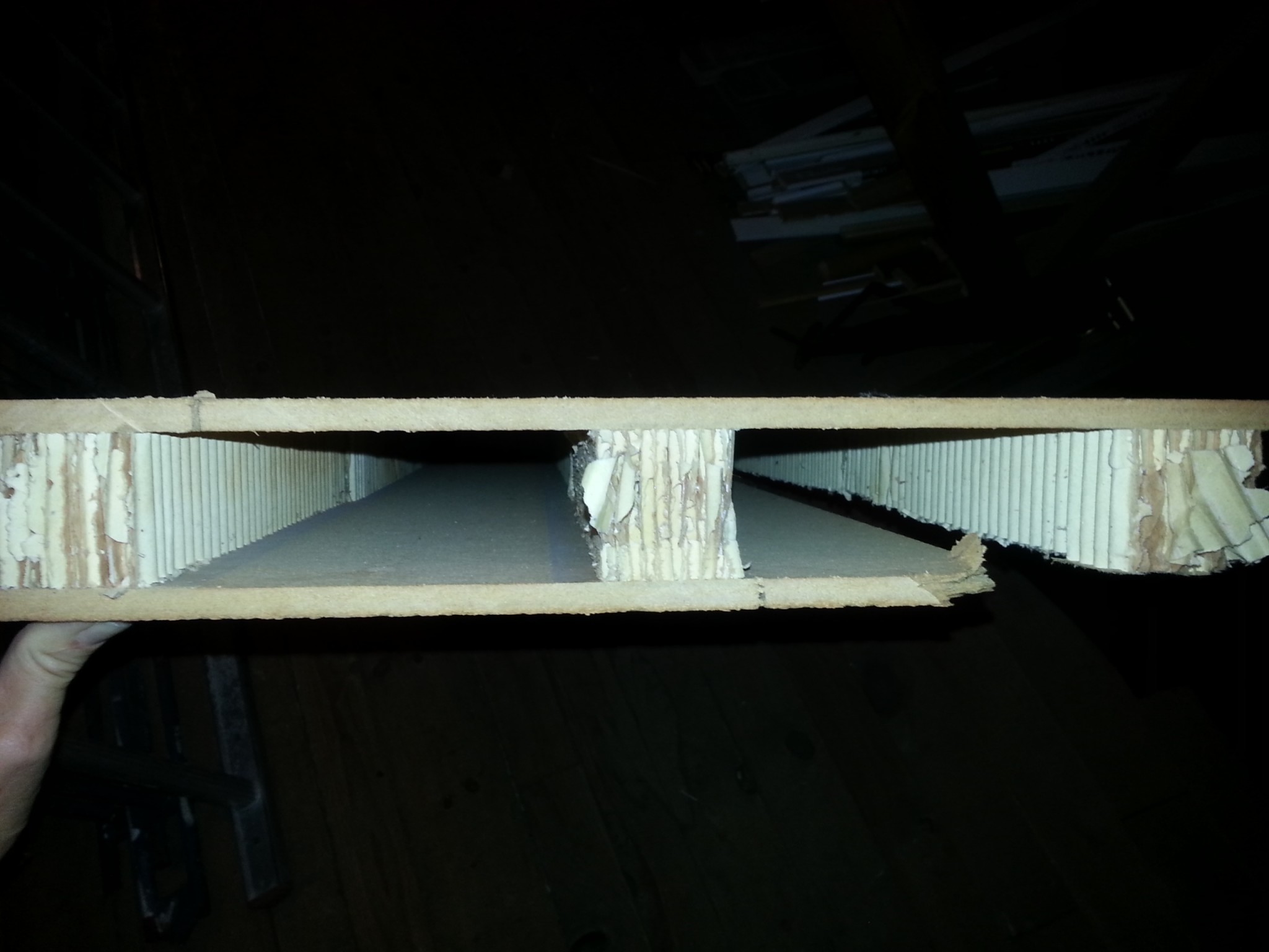 Bara en formsak, men ändå, det är inte mdf, det är ngn form av skiva såsom masonit el tretex. Tror inte att wellpappen var för ljudet utan för bärighet/styvhet. Många simpla innerdörrar består av en klen ram av massivträ, tv skivor masonit och wellpapp/bikakepapp i mellanrummet, allt limmat ihop. Blir en lätt och hyfsat stabil konstruktion.
