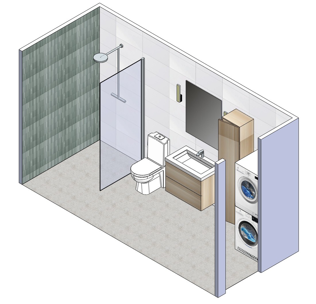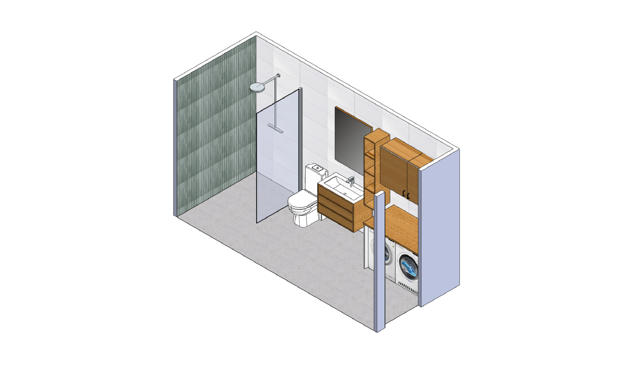 Jag håller på att välja inredning till ena badrummet i huset som jag nu bygger. Bifogar CAD-bilder som visar hur jag har tänkt. Kakel och klinker är jag ganska nöjd med, men när det gäller möblerna är jag lite mer osäker. Tänker framförallt på spegeln med inbyggd belysning och det höga skåpet bredvid. Även skåpen över tvättmaskin och torktumlare känns lite tveksamma. Tycker inte det ser helt snyggt ut.