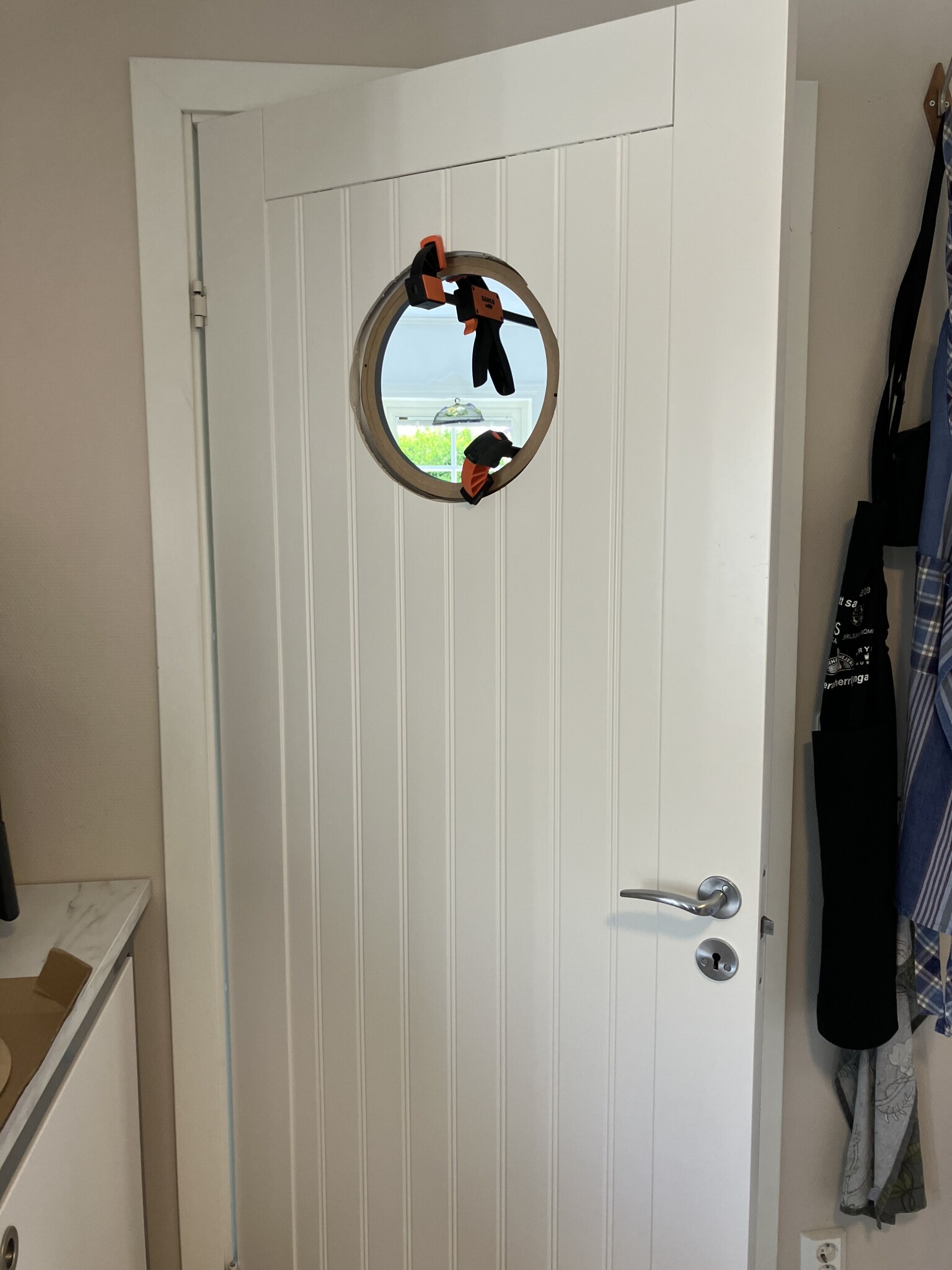 Avser att montera Lundbergs Orust i Swedoor Contur. Fönstret är avsett för ca 40 mm tjocka dörrar. Tänkte därför bygga på med spårad mdf-panel och sågar upp 4 cm innanför ramen och lämnar två ”reglar” för att limma/spika panelen på. Måste nog lägga några bitar runt håltagningen också.
