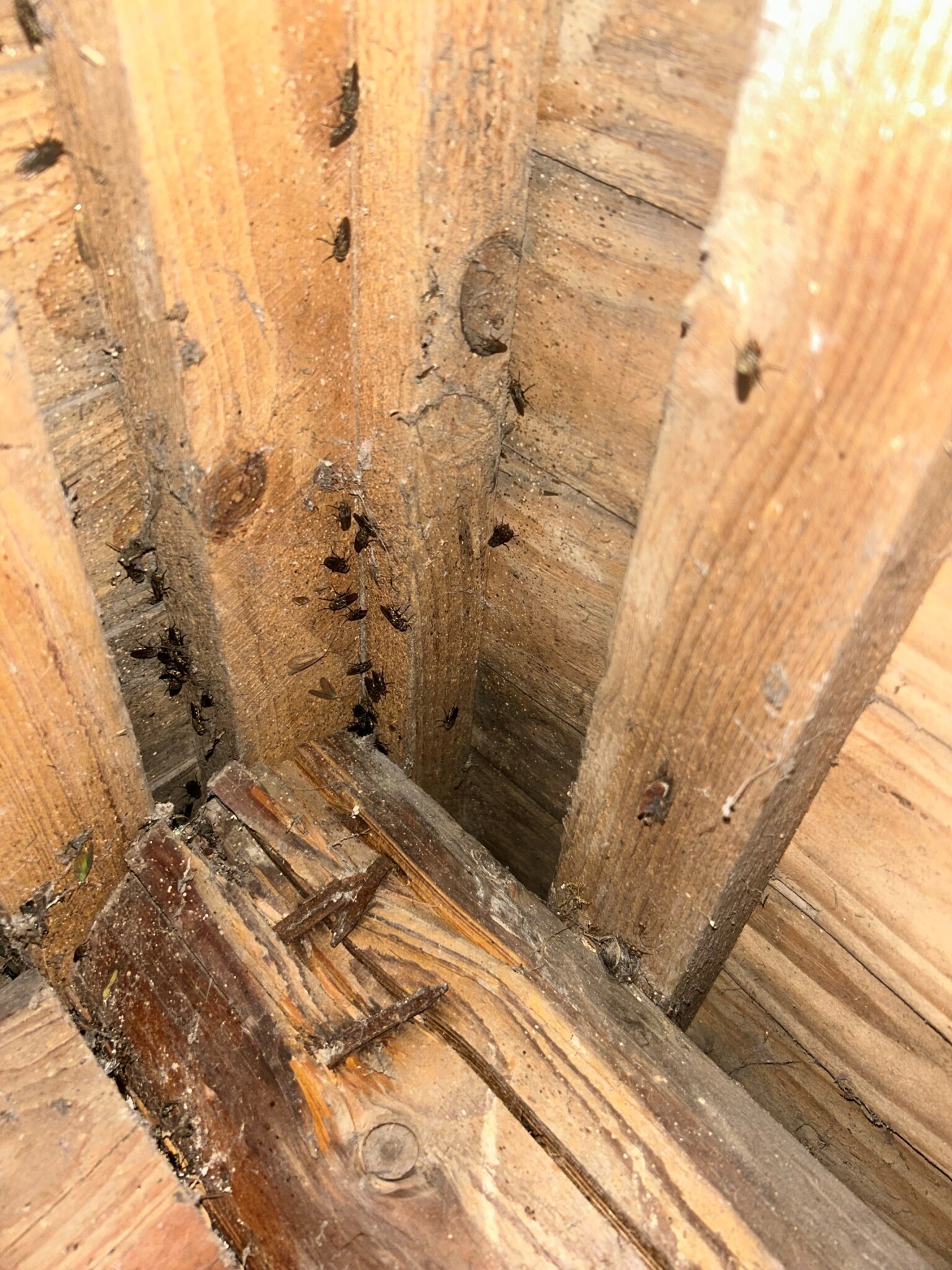 Har precis fått tillträde till vårt nya hus, en tegelvilla i Skåne från 1939 med tegelpannor på taket. Det regnade kraftigt igår så tog mig upp på vinden för att se att allt såg bra ut. Sprang då på dessa insekter i ena ändan av vinden. Jag kan verkligen ingenting om insekter (eller ev. skadedjur). Förhoppningsvis kan någon vänlig själ hjälpa mig.