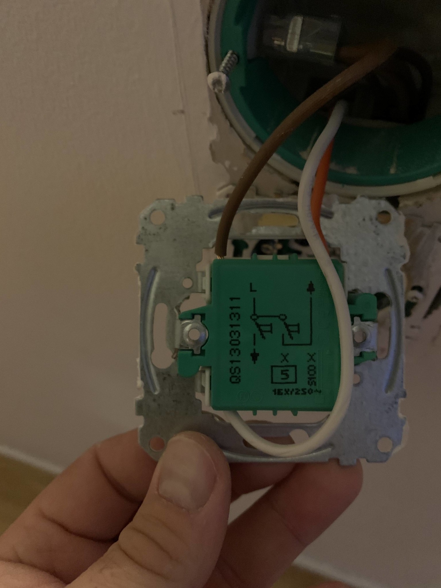 Strömställaren är en kronomkopplare där den vita tändtråden går till spottsen i köket vilka styrs av en dimmerpuck (eltako) som sitter i köket bakom den andra strömställaren. Den oranga går till lamputtagen ovanför matbordet.