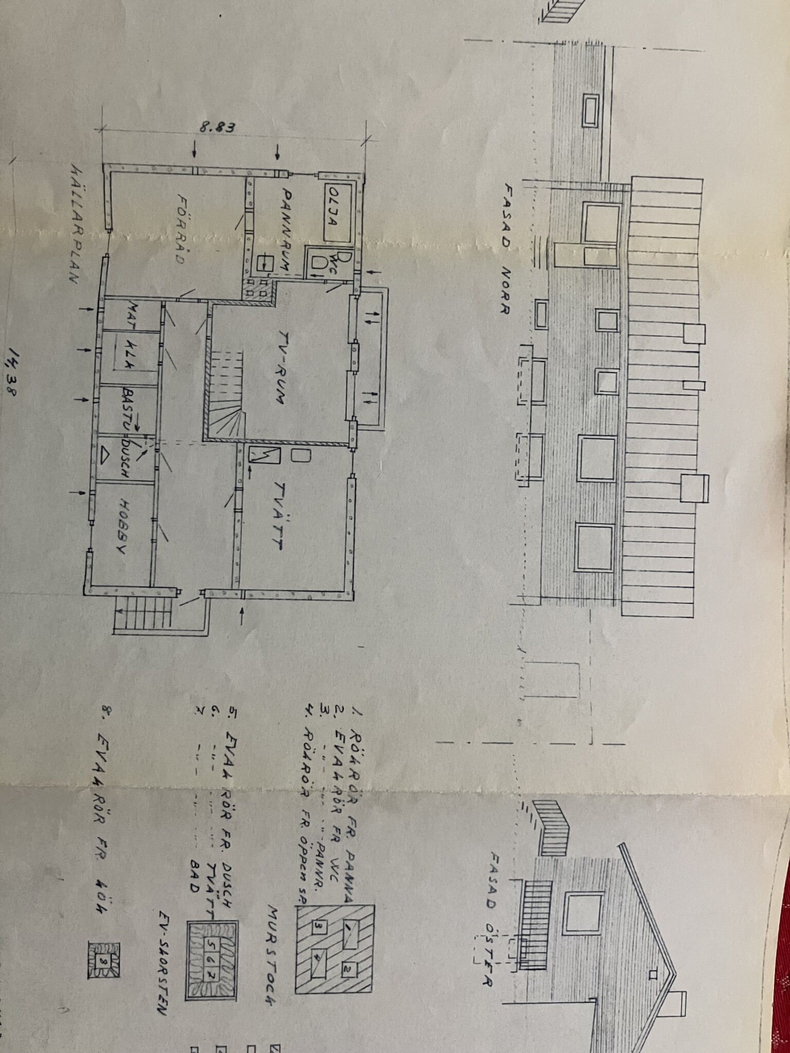 Bilden visar planlösningen i källaren. Kryssen är de tre eternitkanalerna