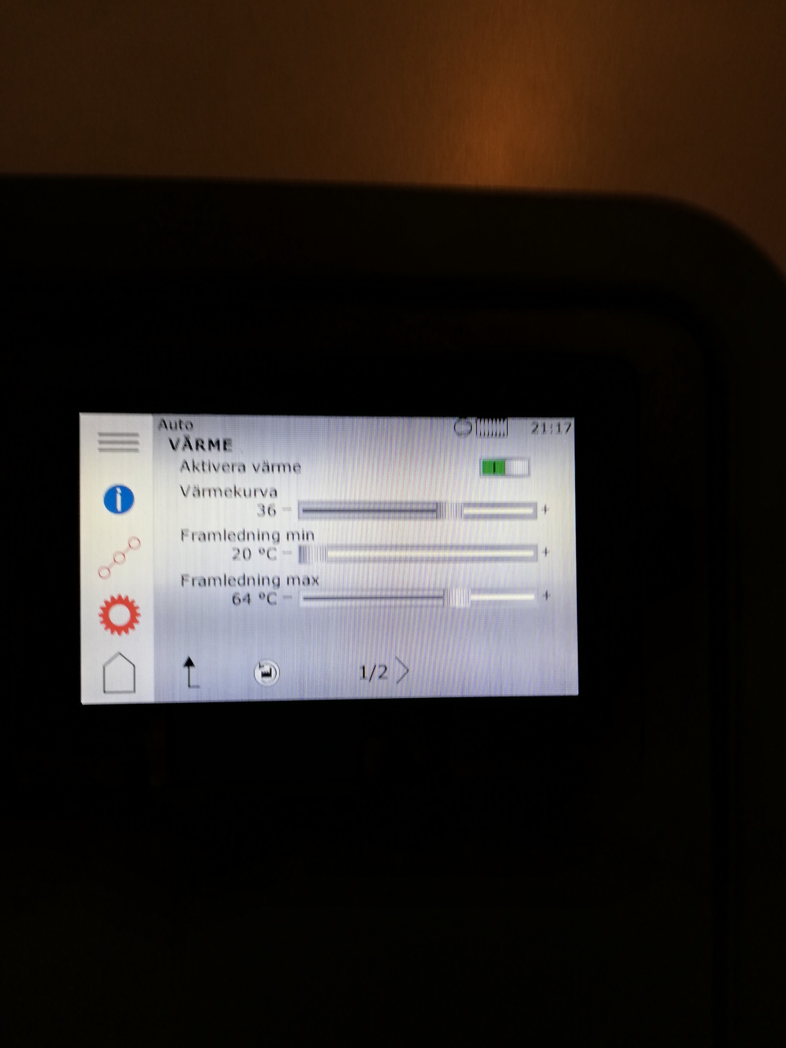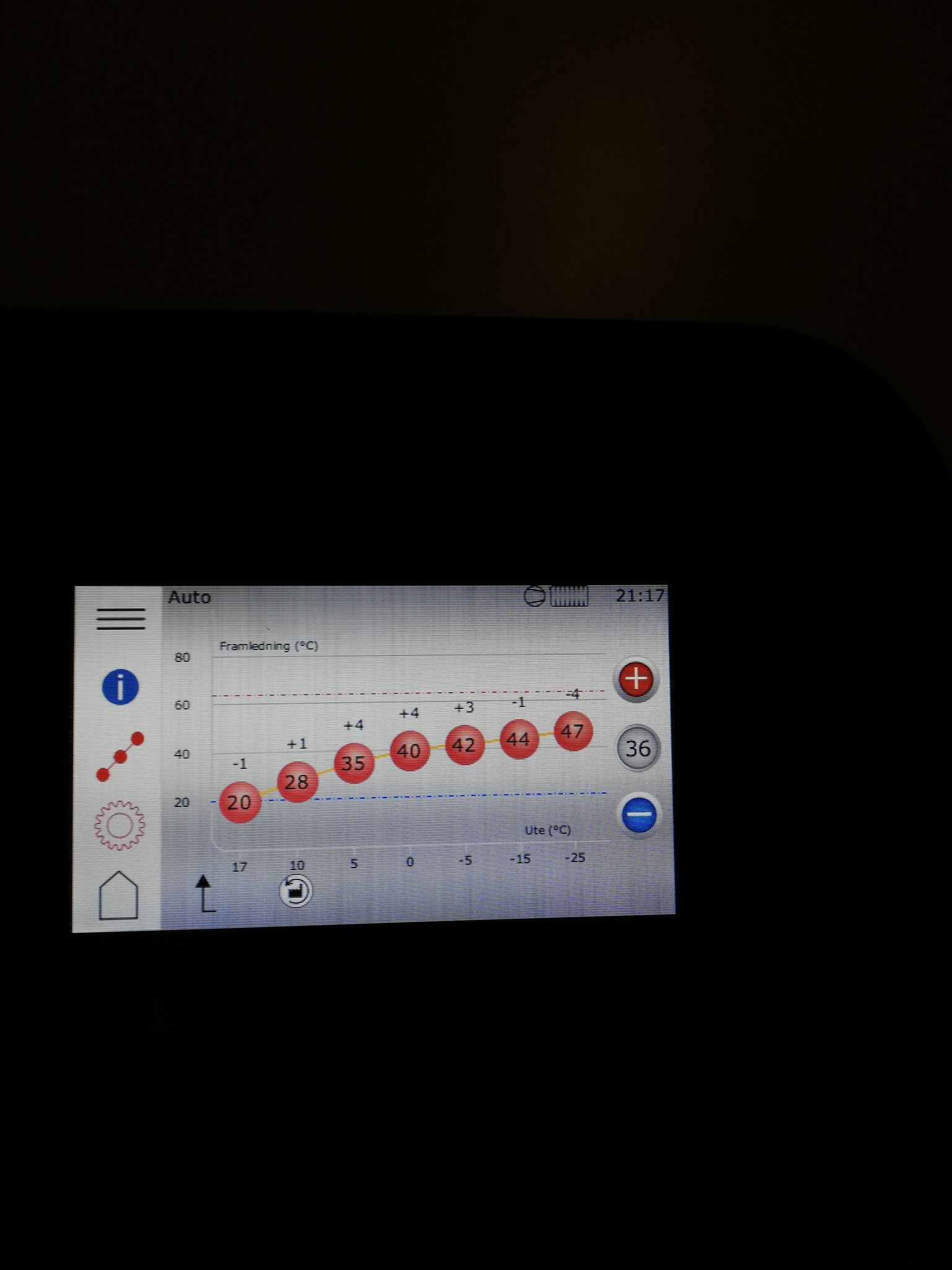I dagsläget försöker vi hålla ca 22-23 grader inne men ibland är vi nere på 20 och i bland uppe på 24. Komforthjulet är ställt på 20 grader (vi drog upp det från 18), den aktuella värmekurvan är kurva 36 och här har tidigare ägare varit inne och ändrat lite (skulle jag tro).