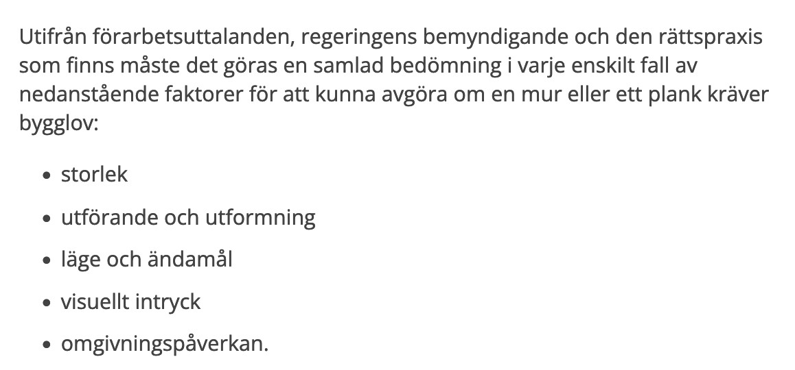 Jag gissar att om man nu skulle få en tillsynsanmälan så skulle byggnadsnämndens medarbetare kunna bedöma det som ett plank om konstruktionen är stor och hög och alltså ger ett dominerande intryck. Praxis säger ju att byggnadsnämnden ska göra en skönsmässig bedömning utifrån några faktorer som ska sammanvägas för att avgöra om det är ett plank eller inte. Boverket listar faktorerna här:L Lutte skrev:Claes du som är väldigt påläst och nu när det behandlas, är inte en lösning att man exempelvis har kraftigt vinklade 22x95 på ett cc av cirka 50mm. Då har man 50% genomsiktlighet men inte från det vågräta planet.