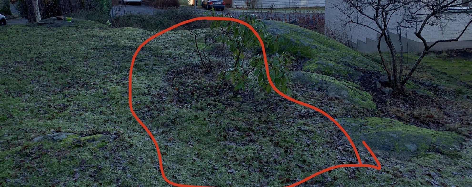 Björkens rötter kommer att bli ett problem. Försök fördröja att de letar sig in i nya planteringsytan, så de nya växterna hinner etablera sig. Några mer anspråkslösa buskhäckar är skogskornell, blåtry, rönnspirea och måbär. Naverlönn blir lite större. Det går inte att plantera där det är berg i dagen så klart, minst 40 cm djup krävs, om de kan hitta mer jordmån runtikring och att ni håller koll så de inte torkar ut. Men björkrötter är som sagt giriga och kan göra att det läget blir svåretablerat. Ett alternativ kanske är plank eller tät spaljé och en klätterväxt.