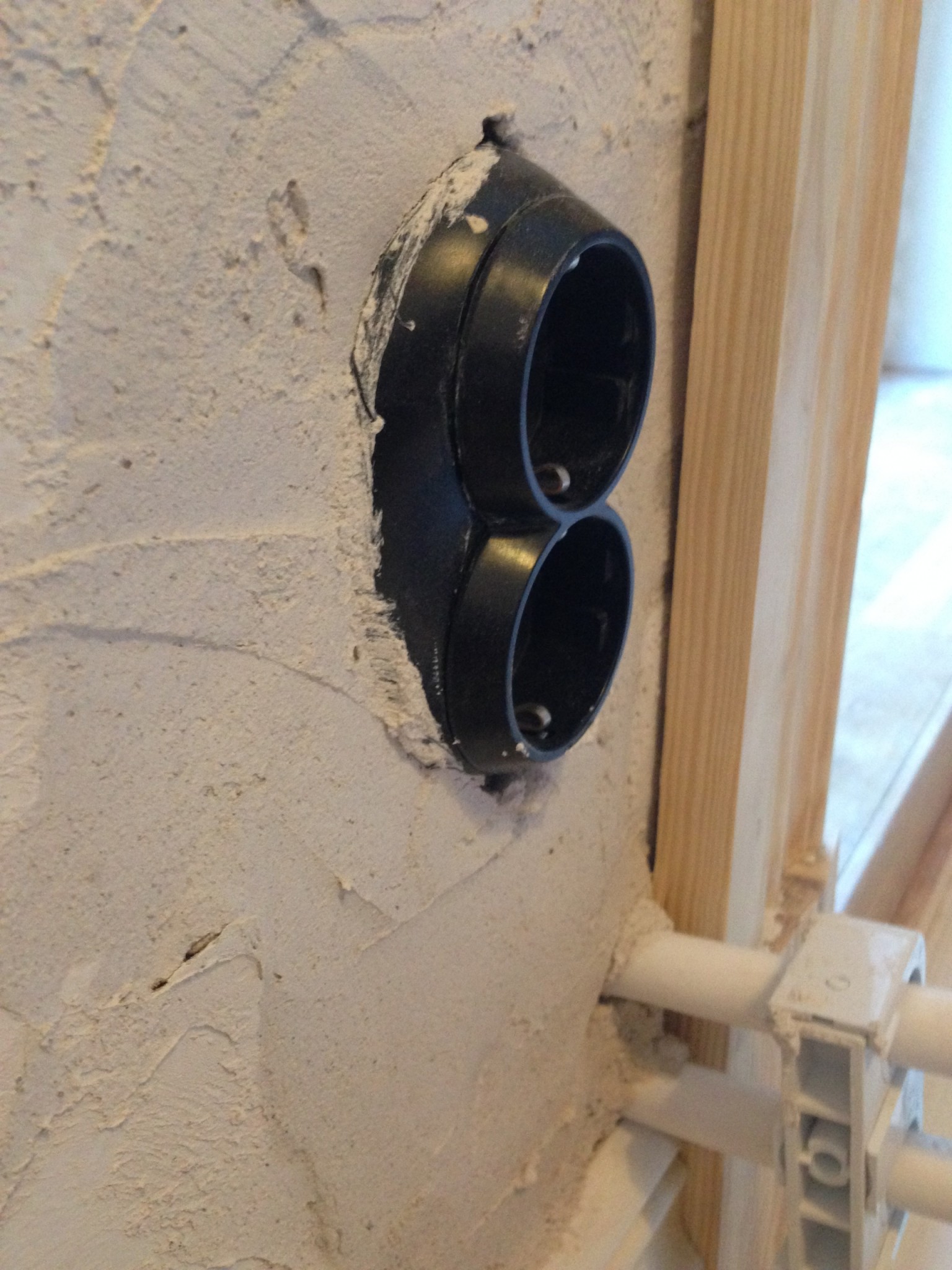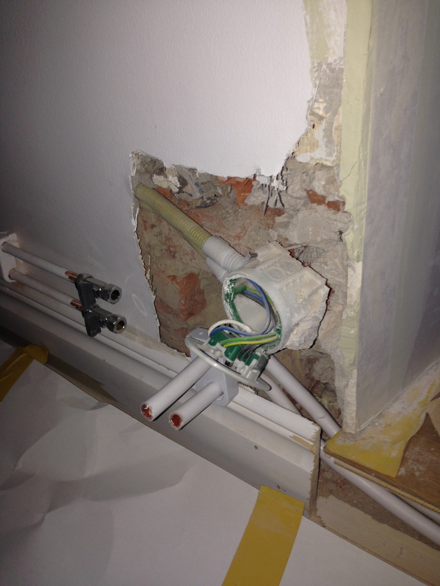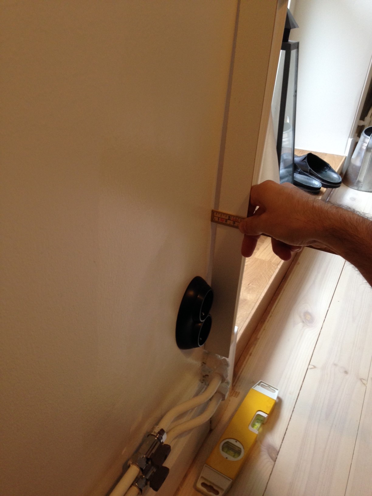 Ett par bilder som jag tog när de höll på att jobba visar lite vilken nivå hantverkarna ligger på och förklarar varför väggen buktar och listerna skeva.