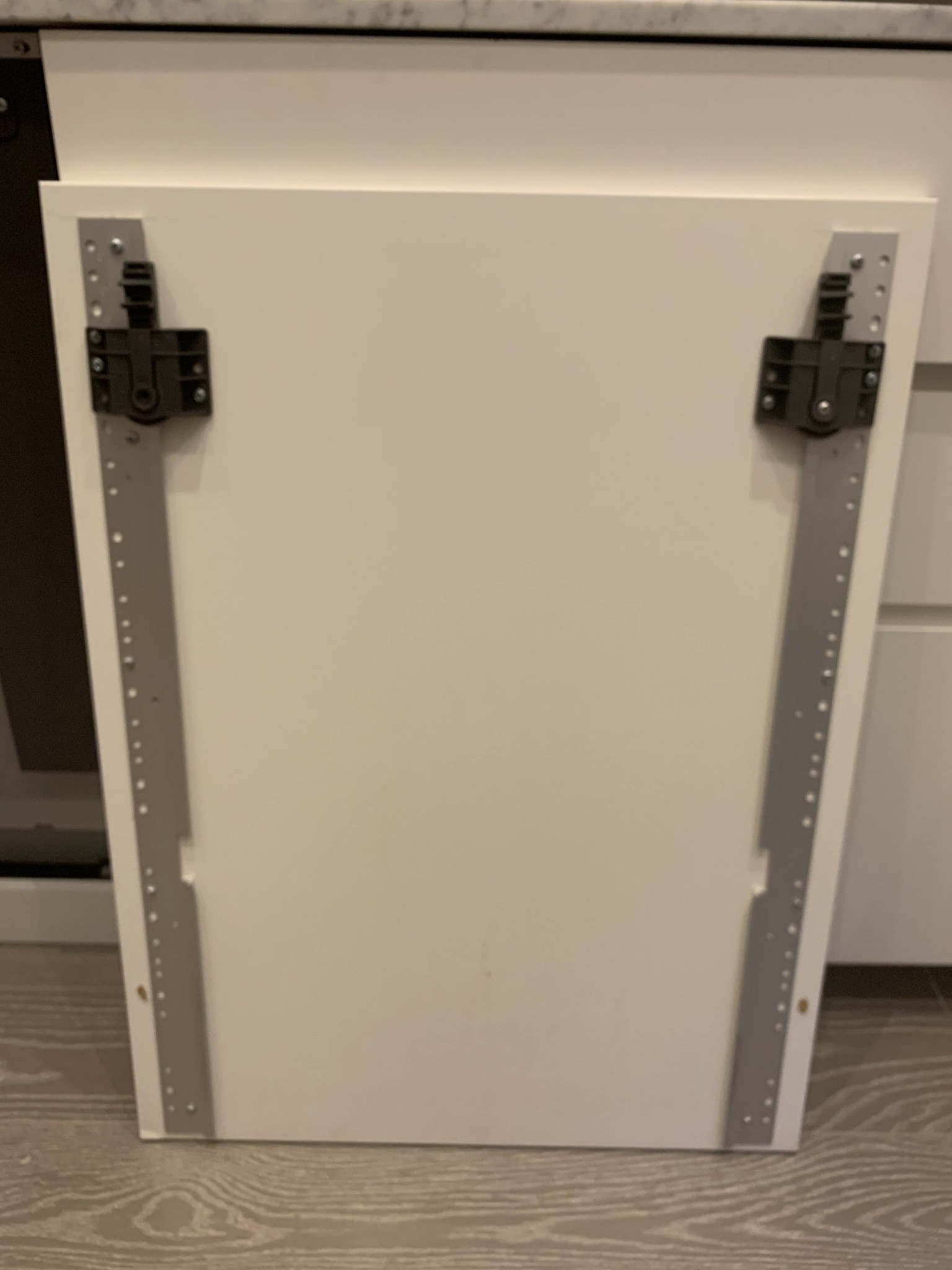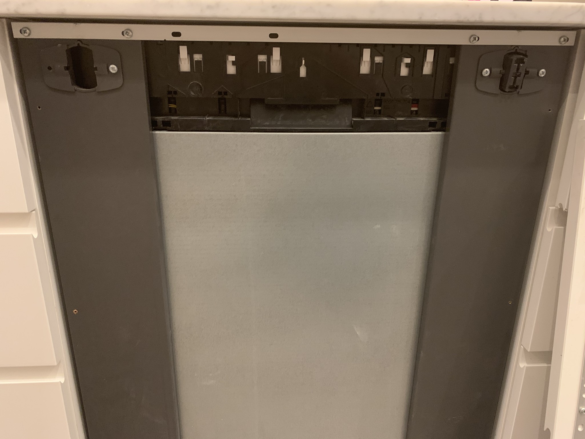 Utan att vara helt säker så tror jag att det r är en gammal koppling från Ikea som satt mellan köksluckan och diskmaskinen för att skapa en ”glidande lucka” för att kunna hantera låga socklar innan många leverantörer själva byggde in det i maskinen. Ikea slutade med dom av ngn anledning. Så även de tio cm breda delarna som sitter på diskmaskinen på bilden är den del av den kopplingsdetaljen. På din diskmaskinen fäster man normalt köksluckan genom att byta ut fyra skruvar på insidan av luckan till längre varianter som då även håller i köksluckan. Men det fungerar nog inte i ditt kök då era socklar ser väldigt låga ut.