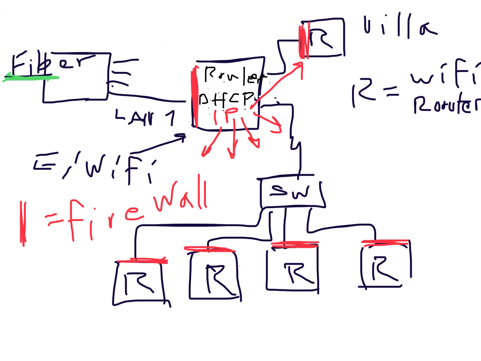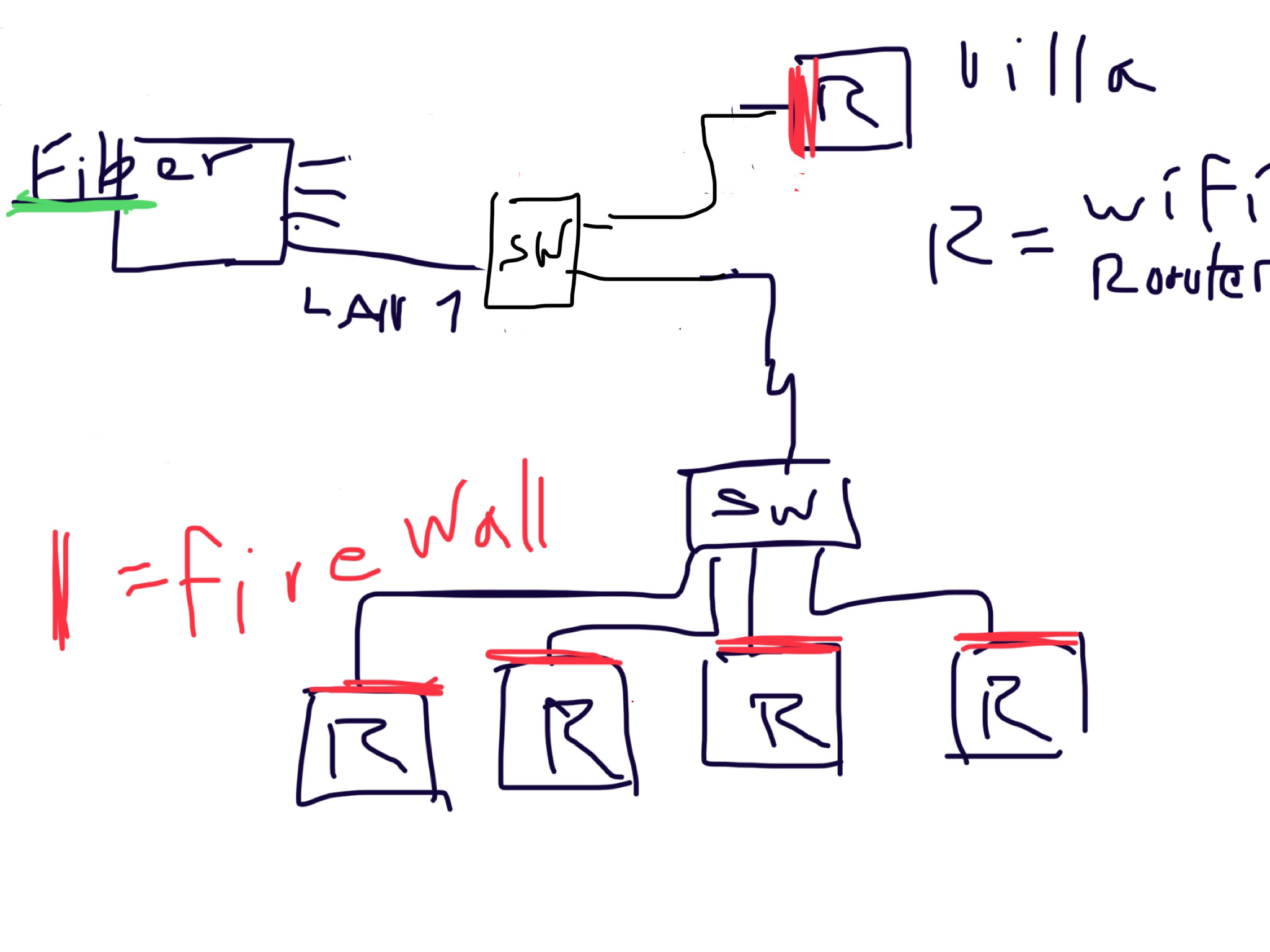 Routern vid mediafördelaren skulle kunna bytas mot en mer avancerad router med VLAN och switchen SW kan ersättas med en managerad VLAN switch, men så länge varje lägenhet har egna wifi-routrar ser jag inte poängen med det.