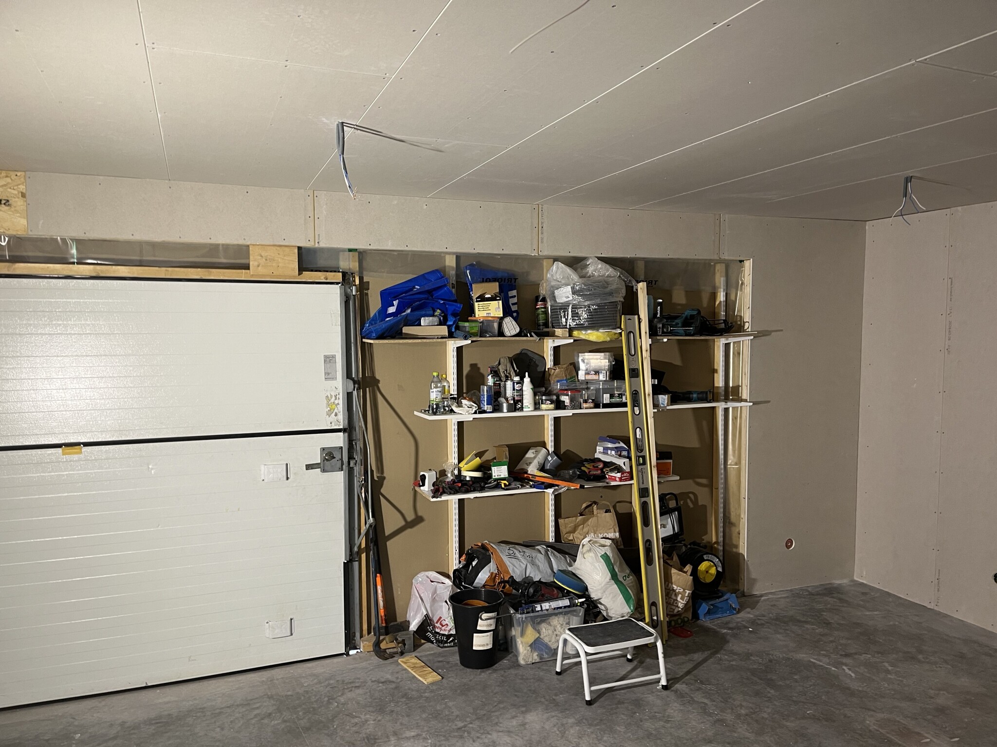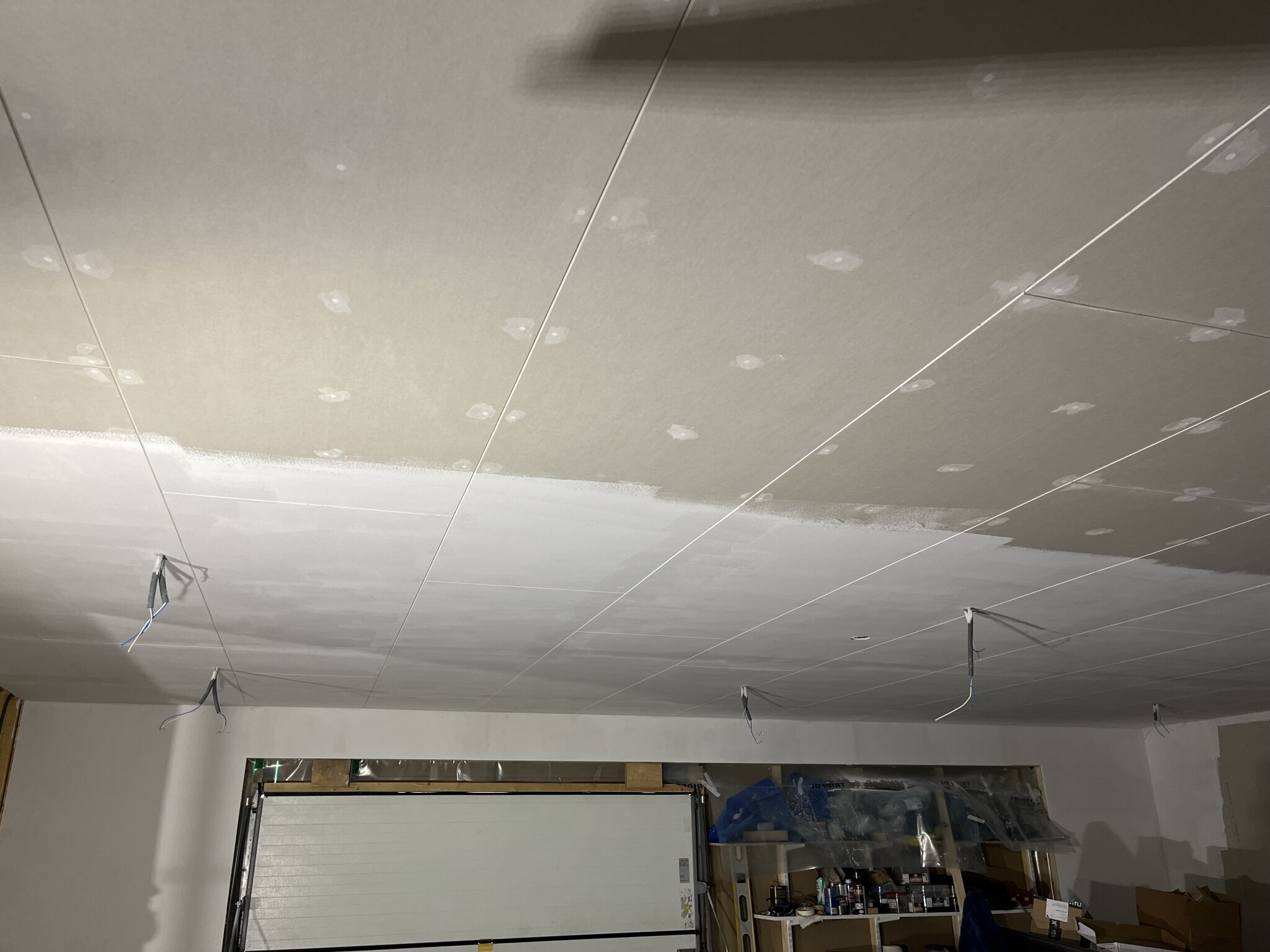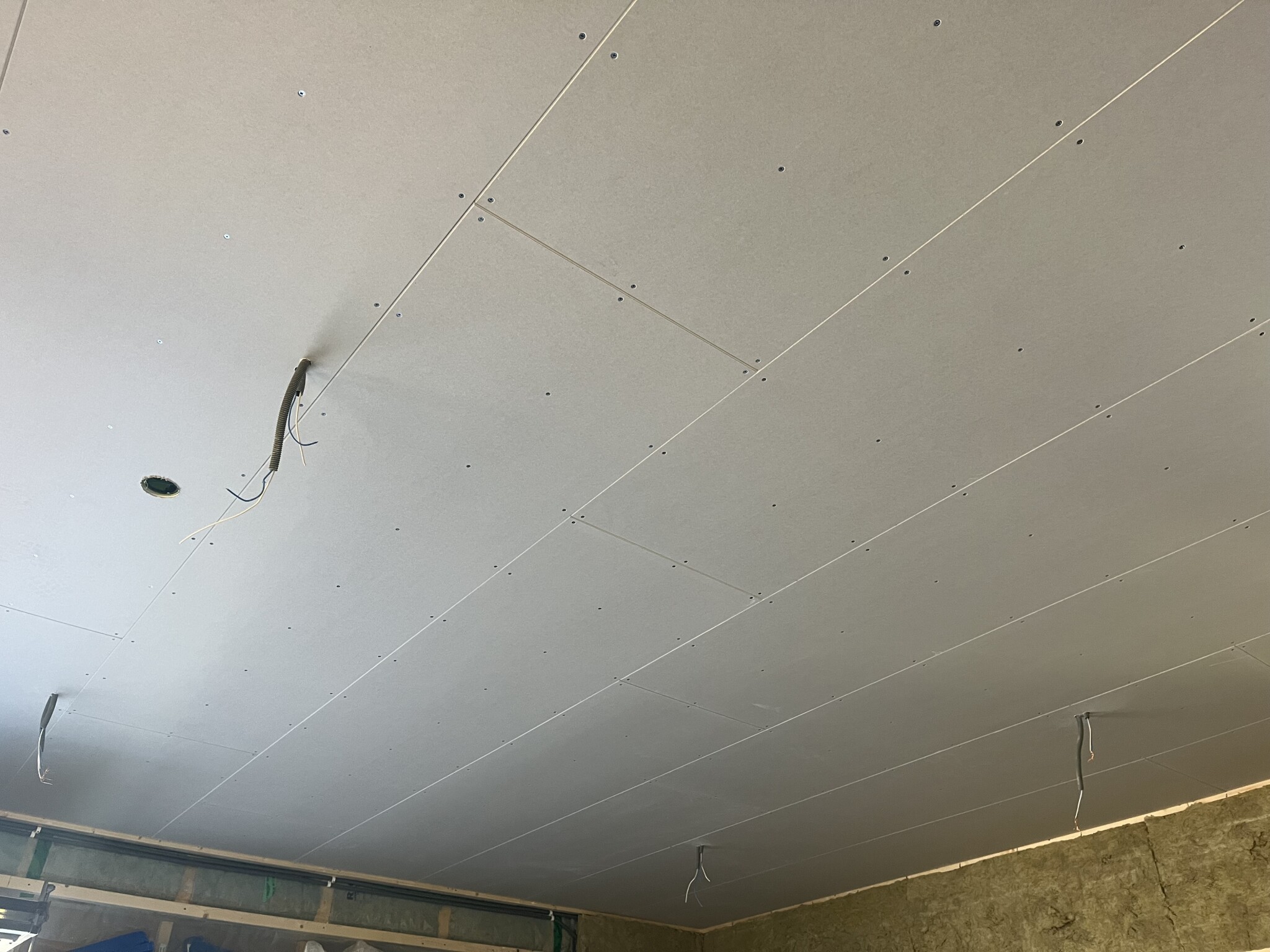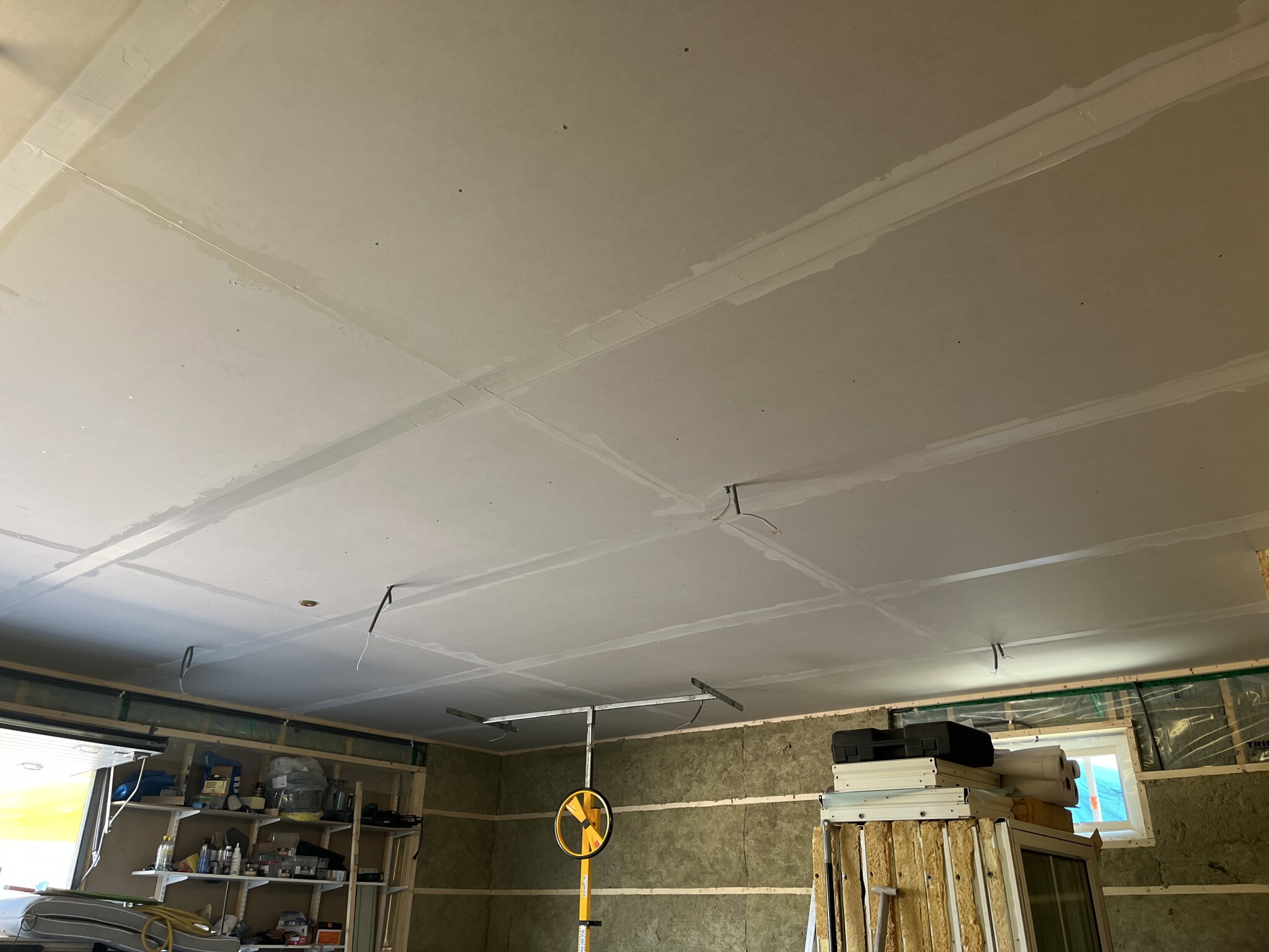 Som jag nämnt tidigare så håller jag på i garaget. Har fått upp gles i bjälklaget, luftat taken, isolerat övervåningen samt plastat och glesat övervåningen. 🙂