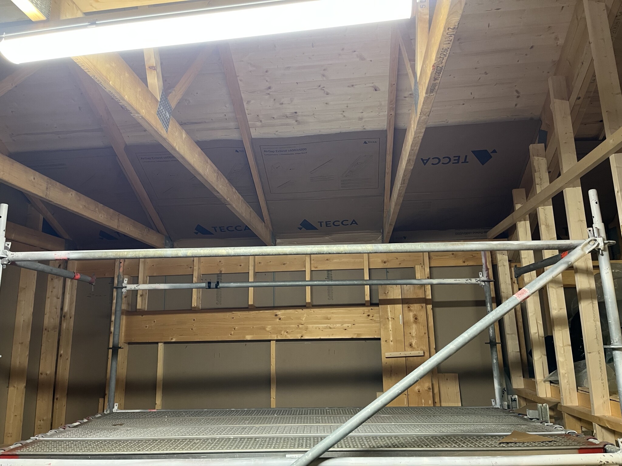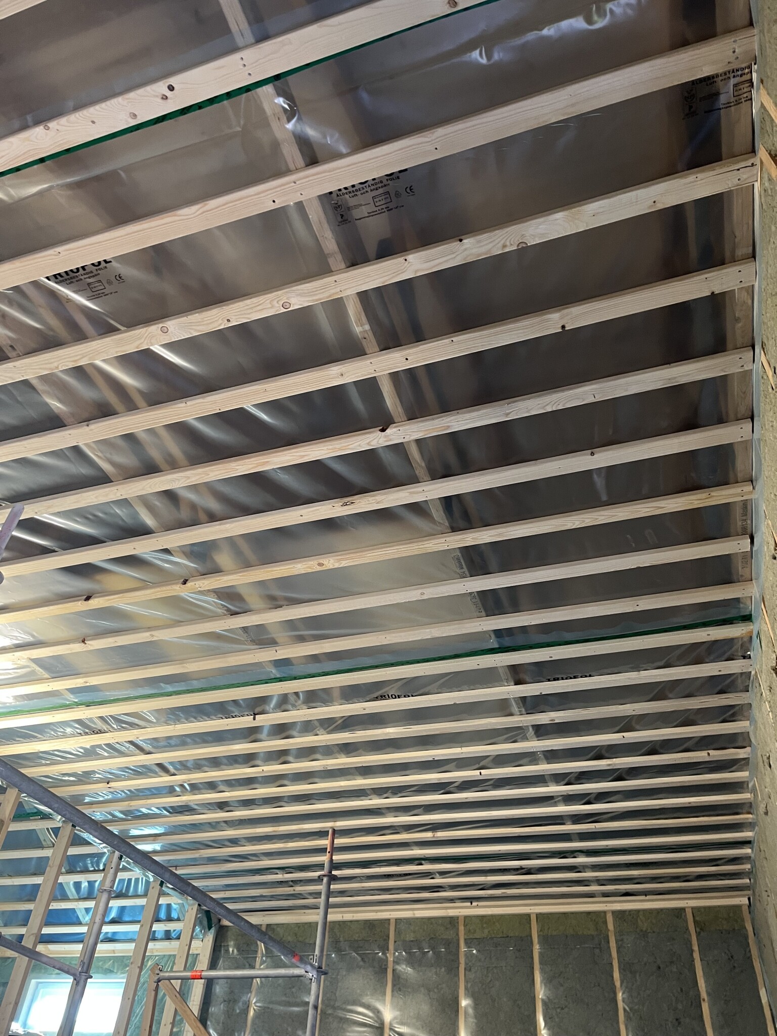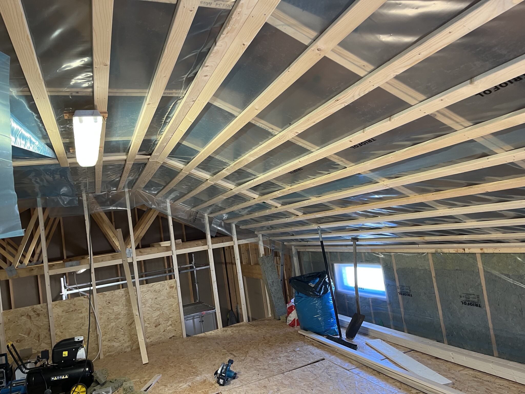 Som jag nämnt tidigare så håller jag på i garaget. Har fått upp gles i bjälklaget, luftat taken, isolerat övervåningen samt plastat och glesat övervåningen. 🙂