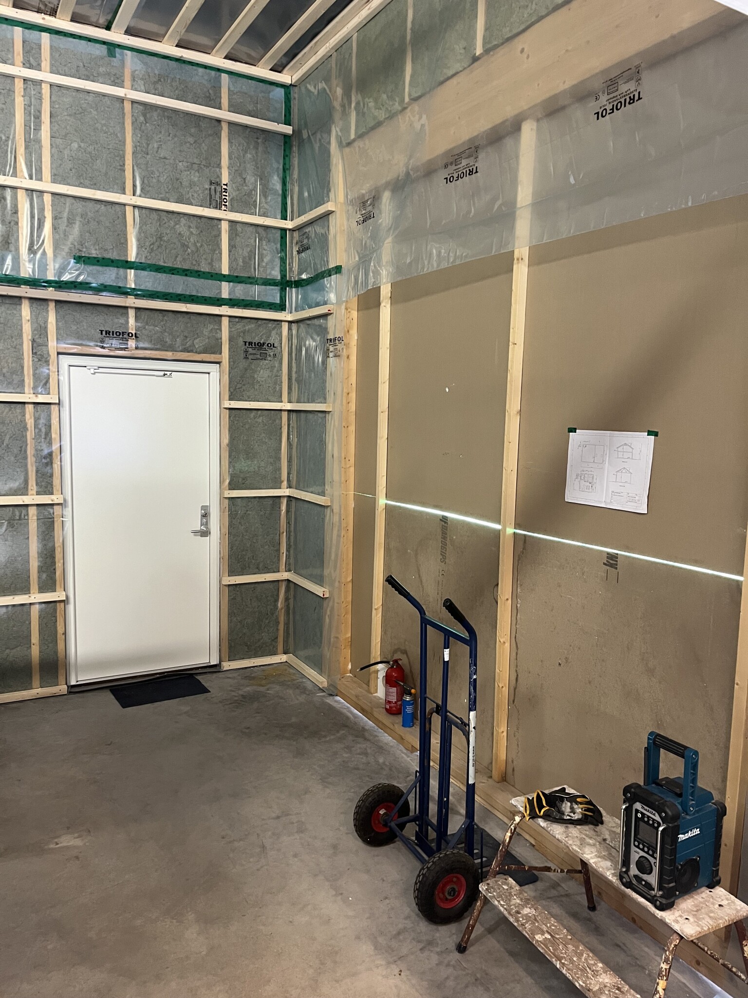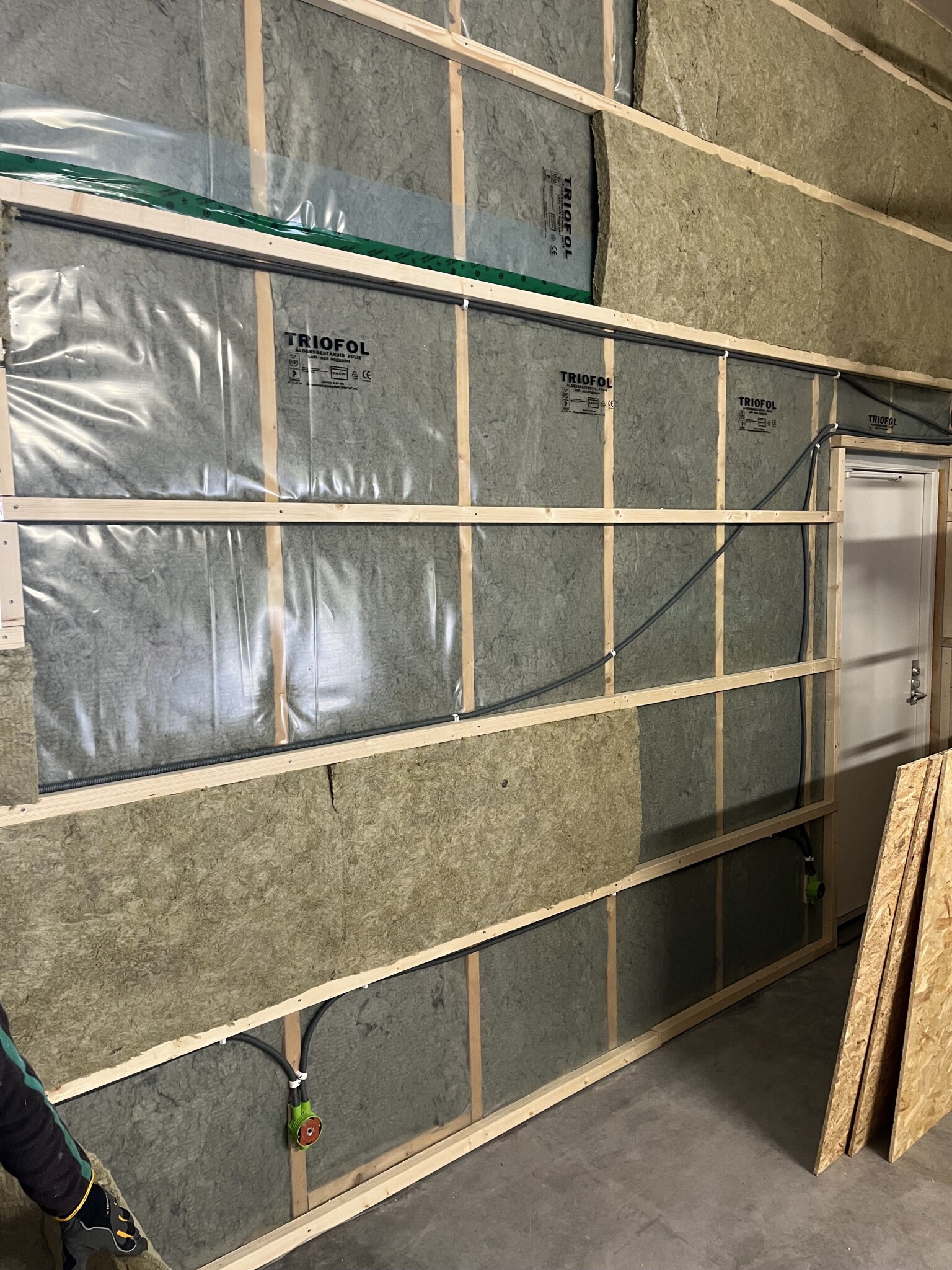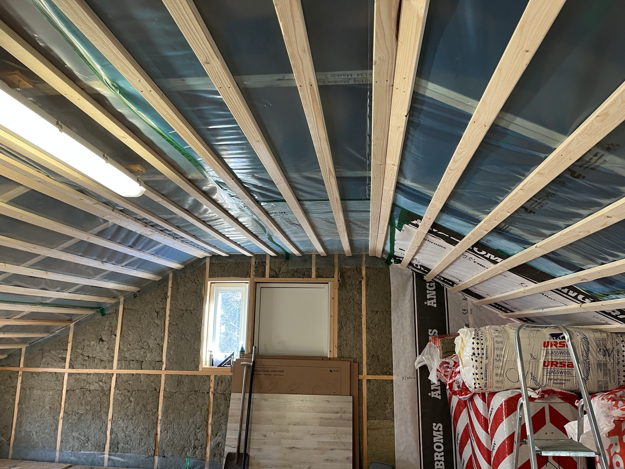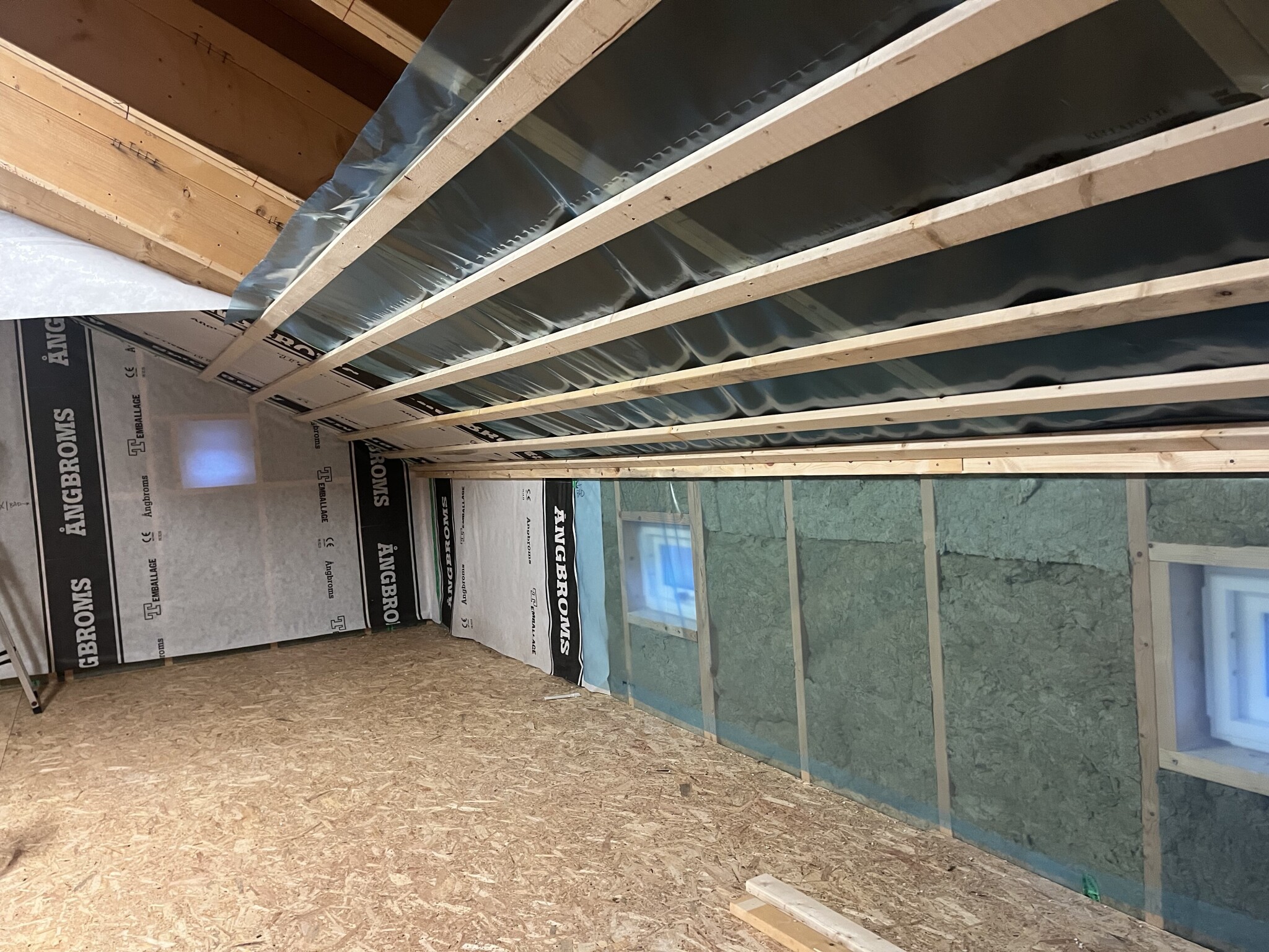 Har fått isolerat samtliga väggar och fått upp plast samt 2”2. Även lösullen i taken är på plats.🙂