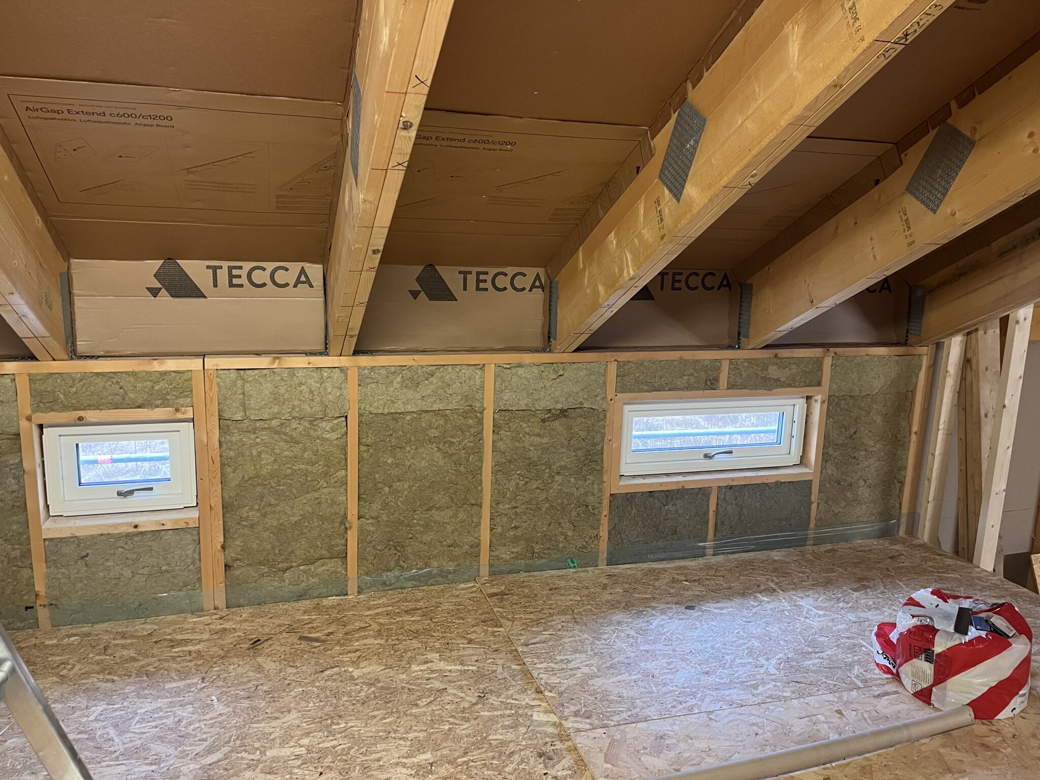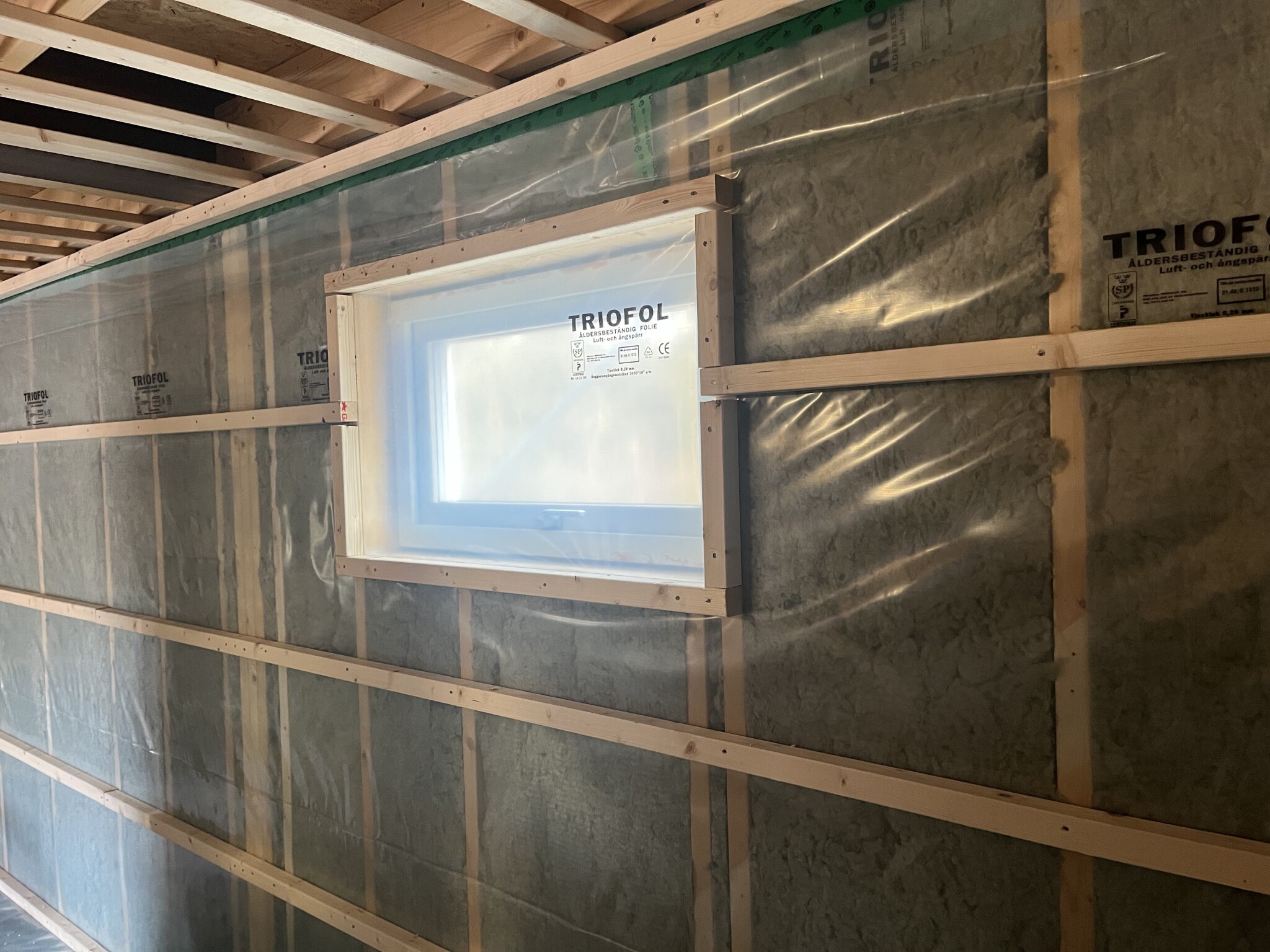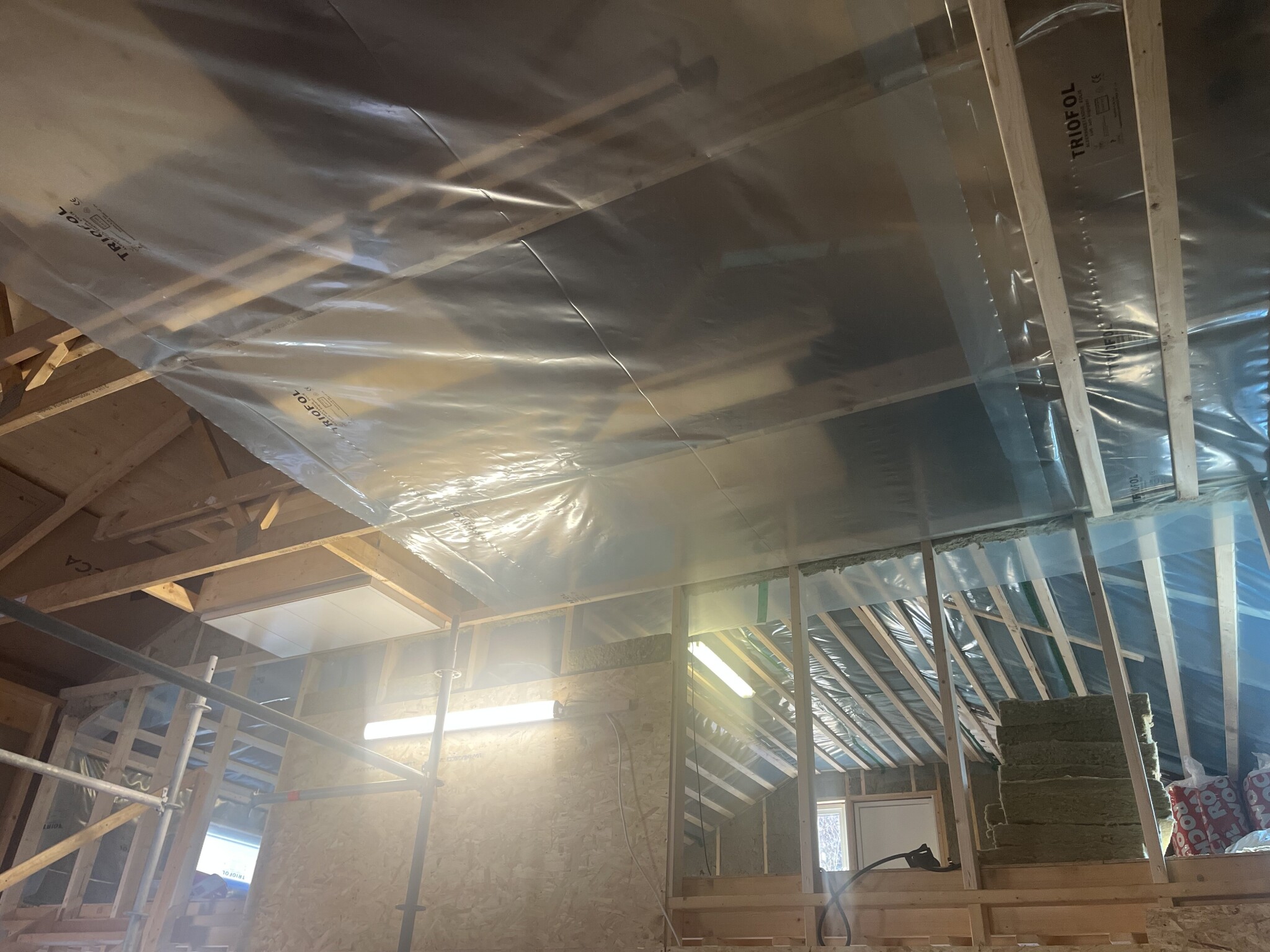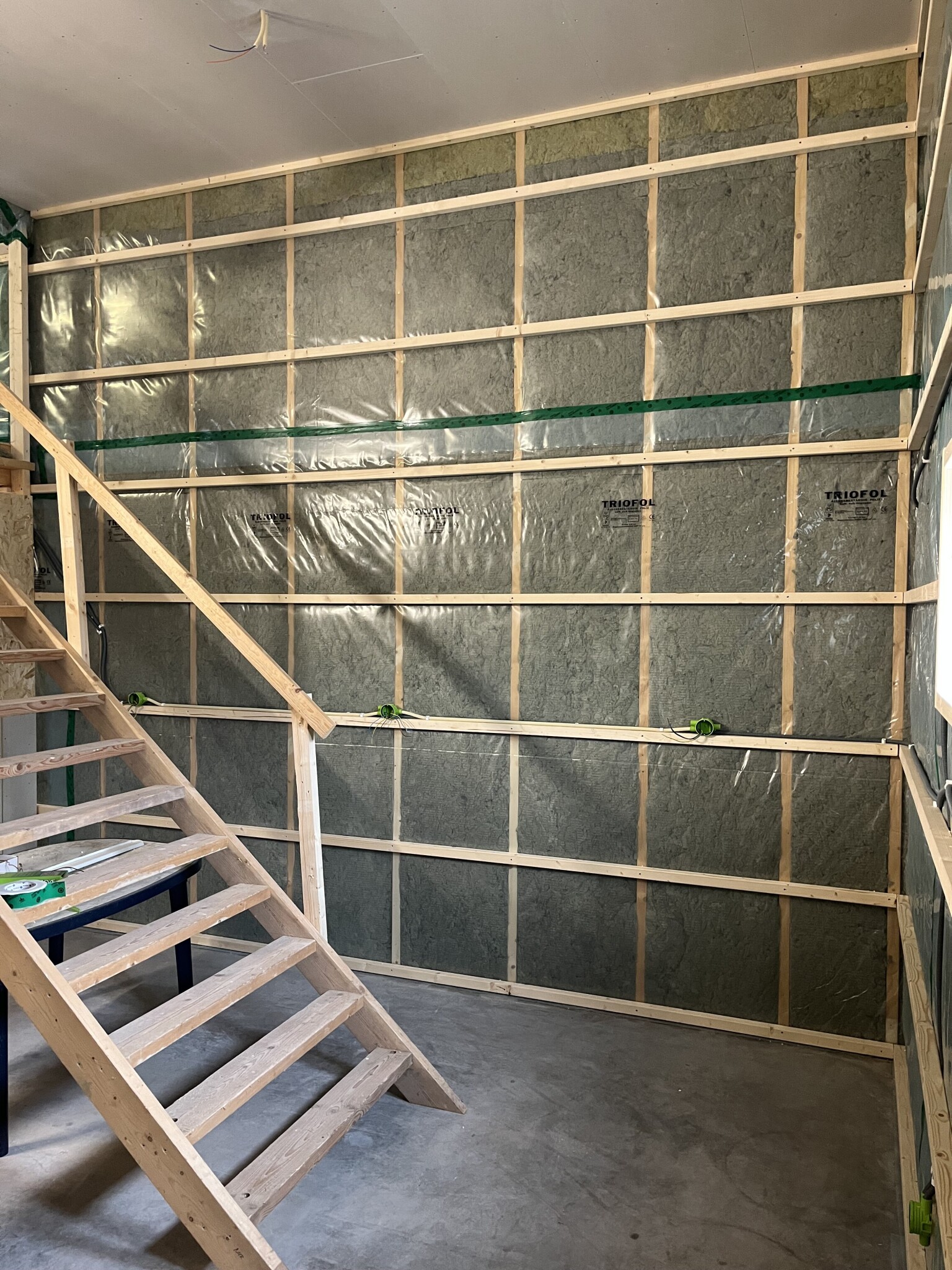 Har fått isolerat samtliga väggar och fått upp plast samt 2”2. Även lösullen i taken är på plats.🙂