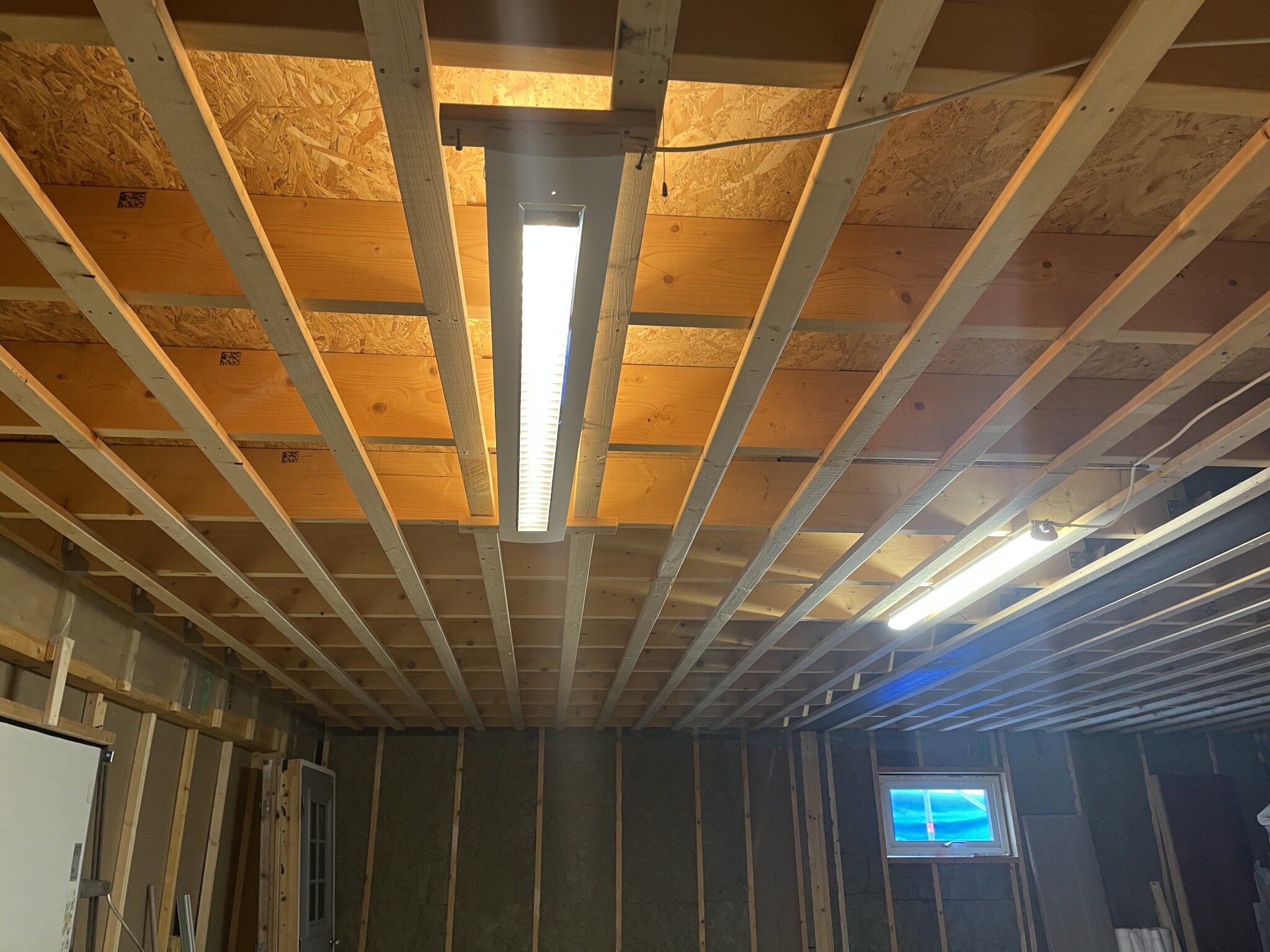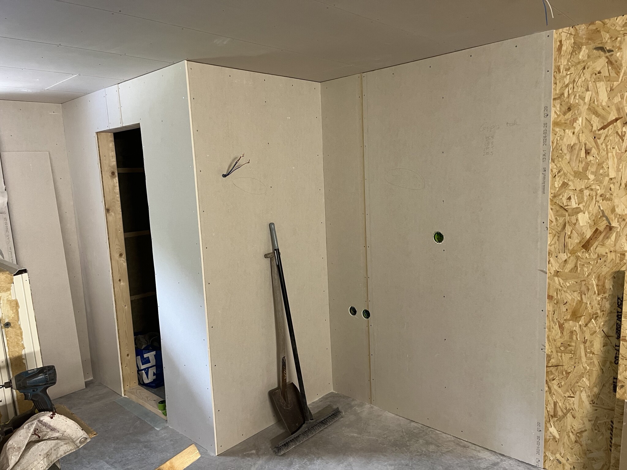 Fortsättning, elen är ”klar”, så det är färdigt för att börja skiva. Har också byggt upp en liten framtida toalett. Gipstaket i högdelen har kommit upp, valde gipsplank 60x240. 🙂
