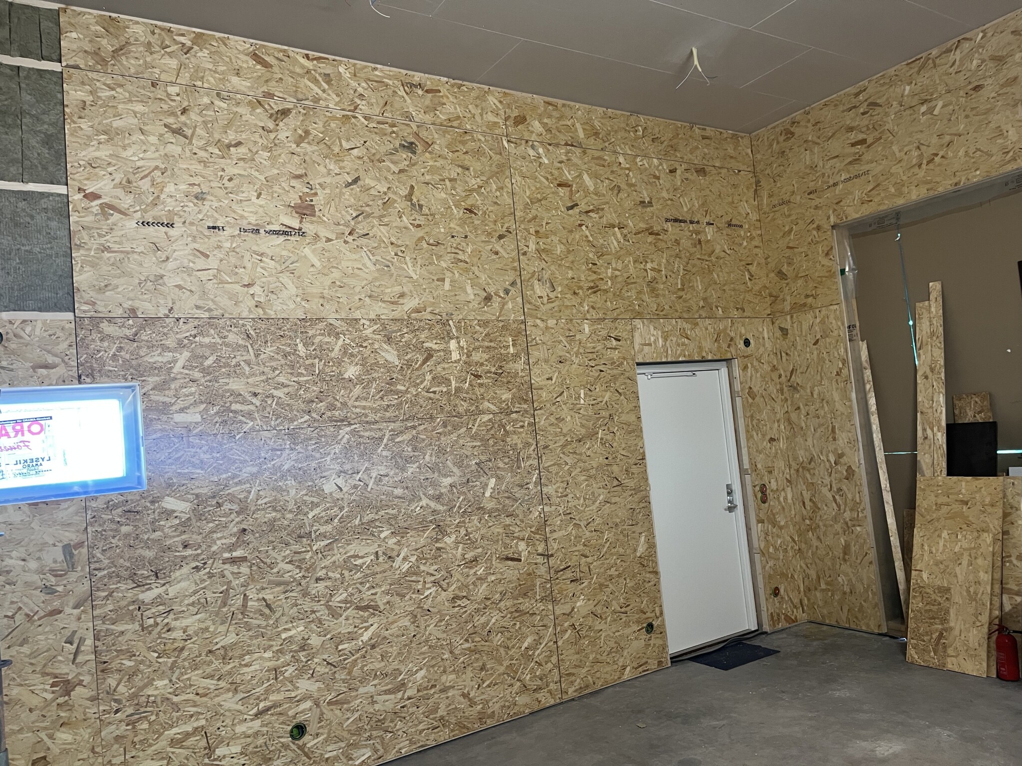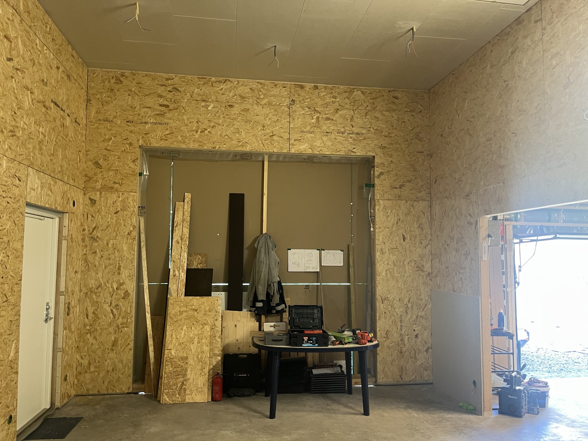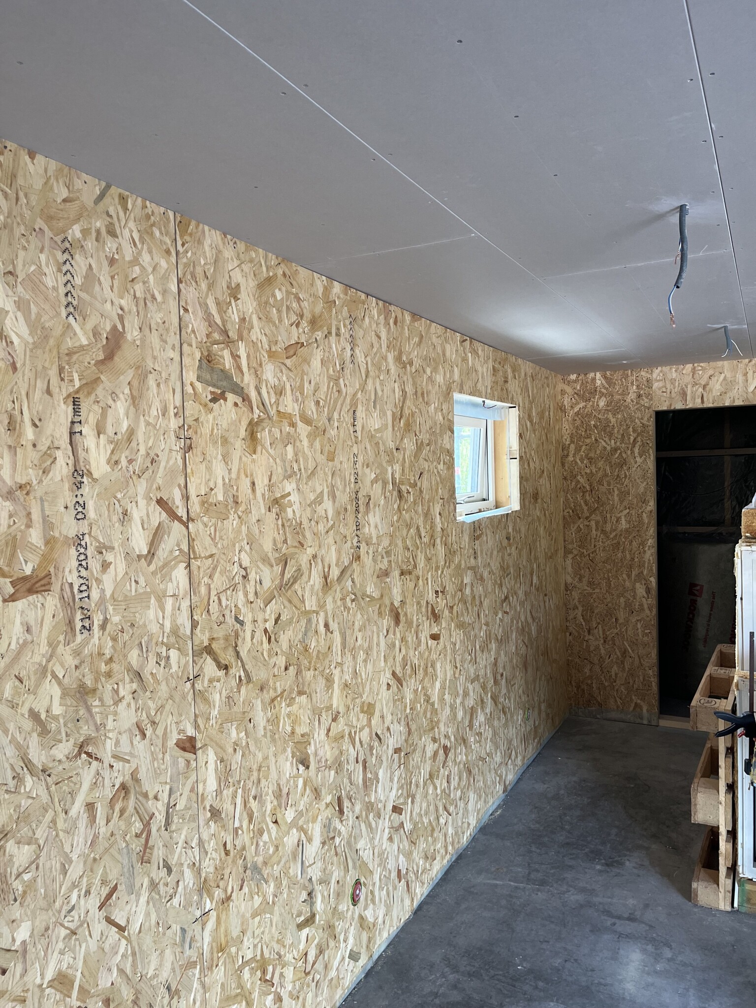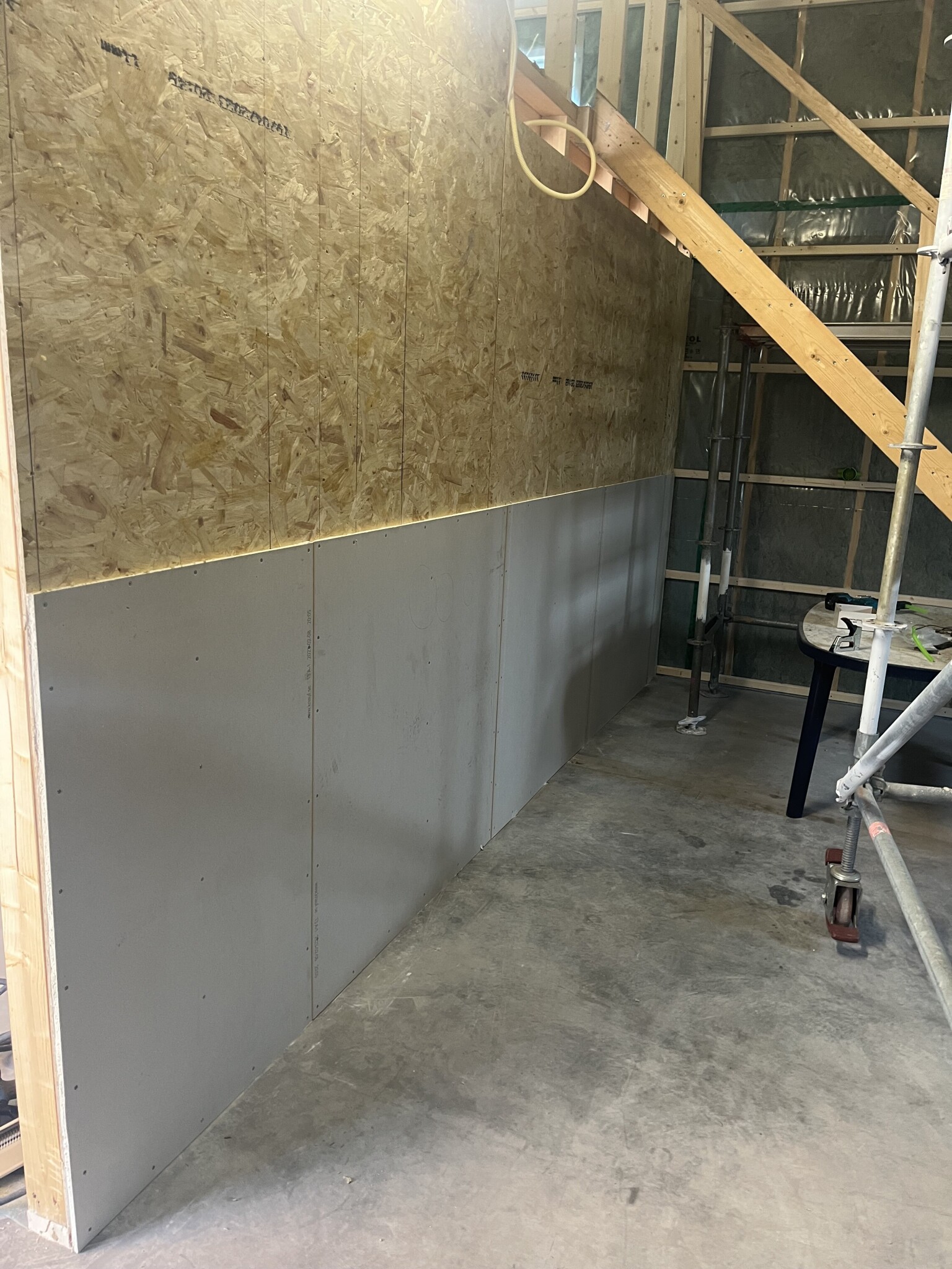 Fortsättning även i lågdelen, osb på väggar samt gips i taket. Först ett lager vanlig med spackel och sedan 240-plank.🙂