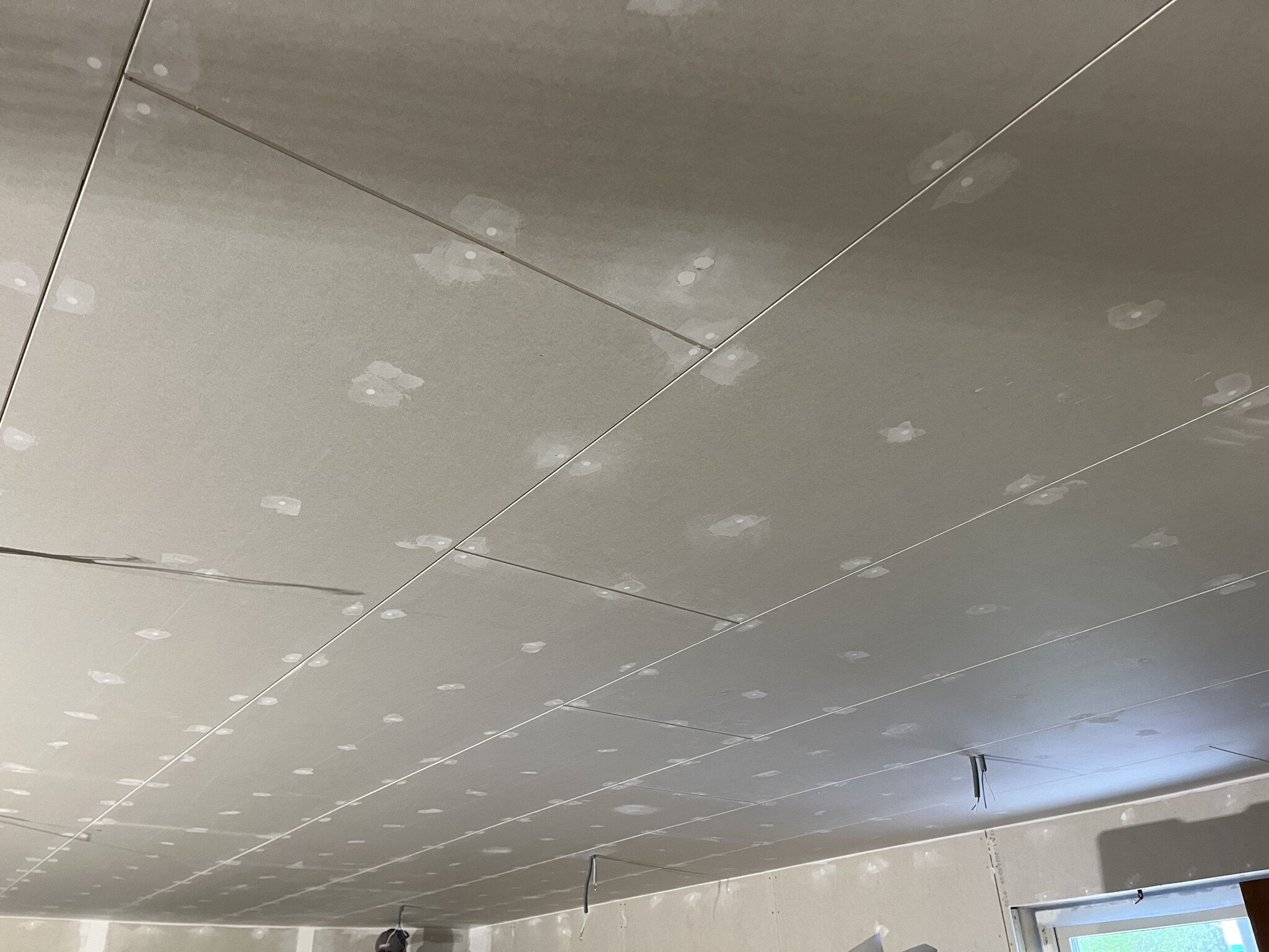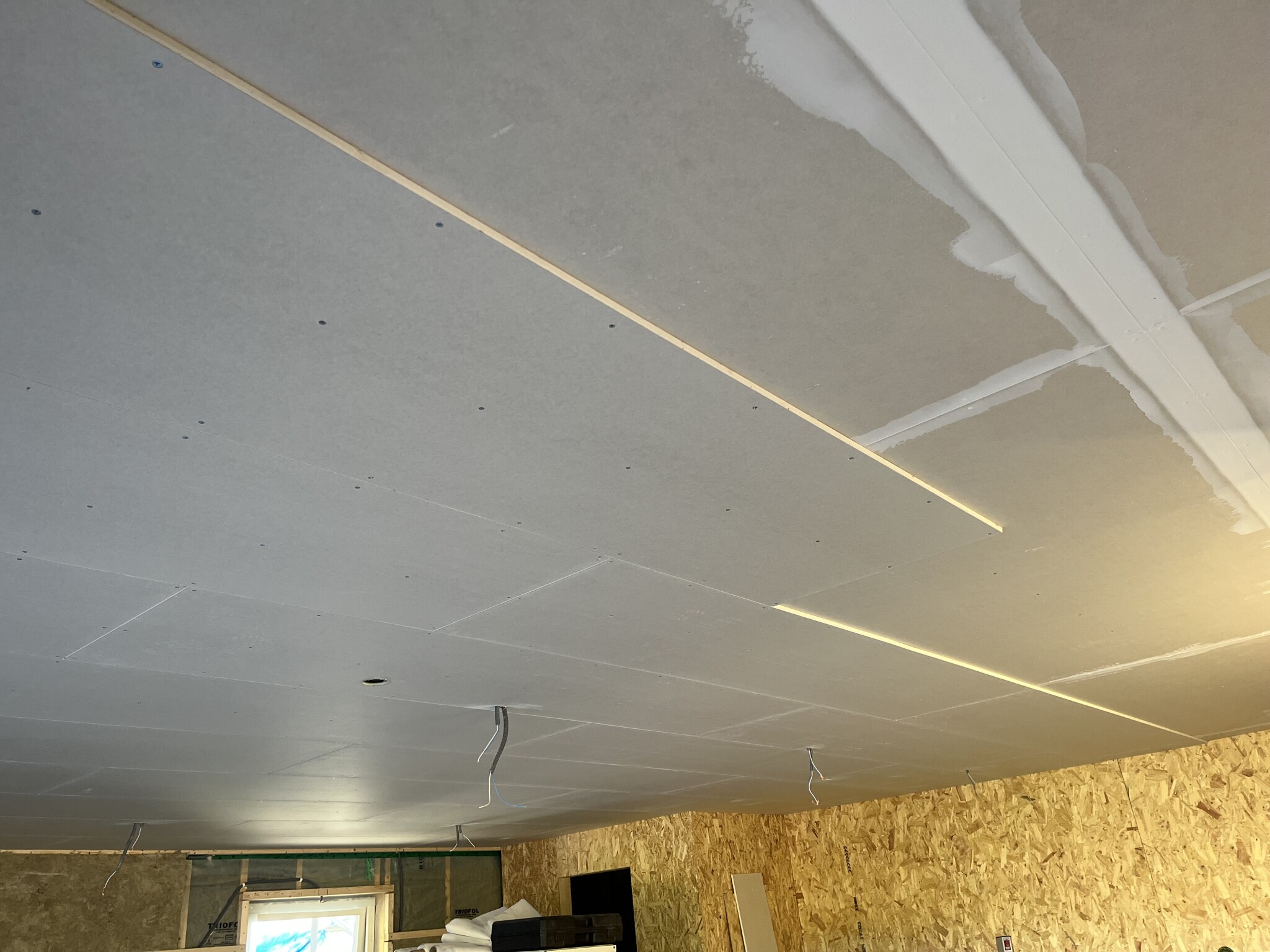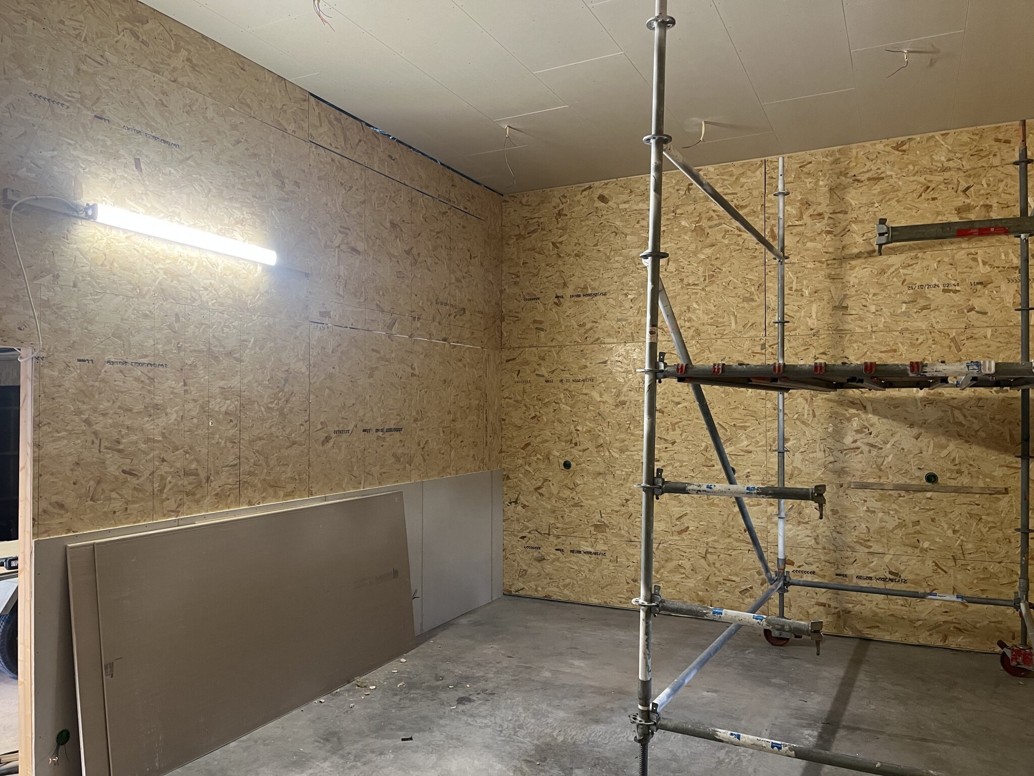 Fortsättning även i lågdelen, osb på väggar samt gips i taket. Först ett lager vanlig med spackel och sedan 240-plank.🙂