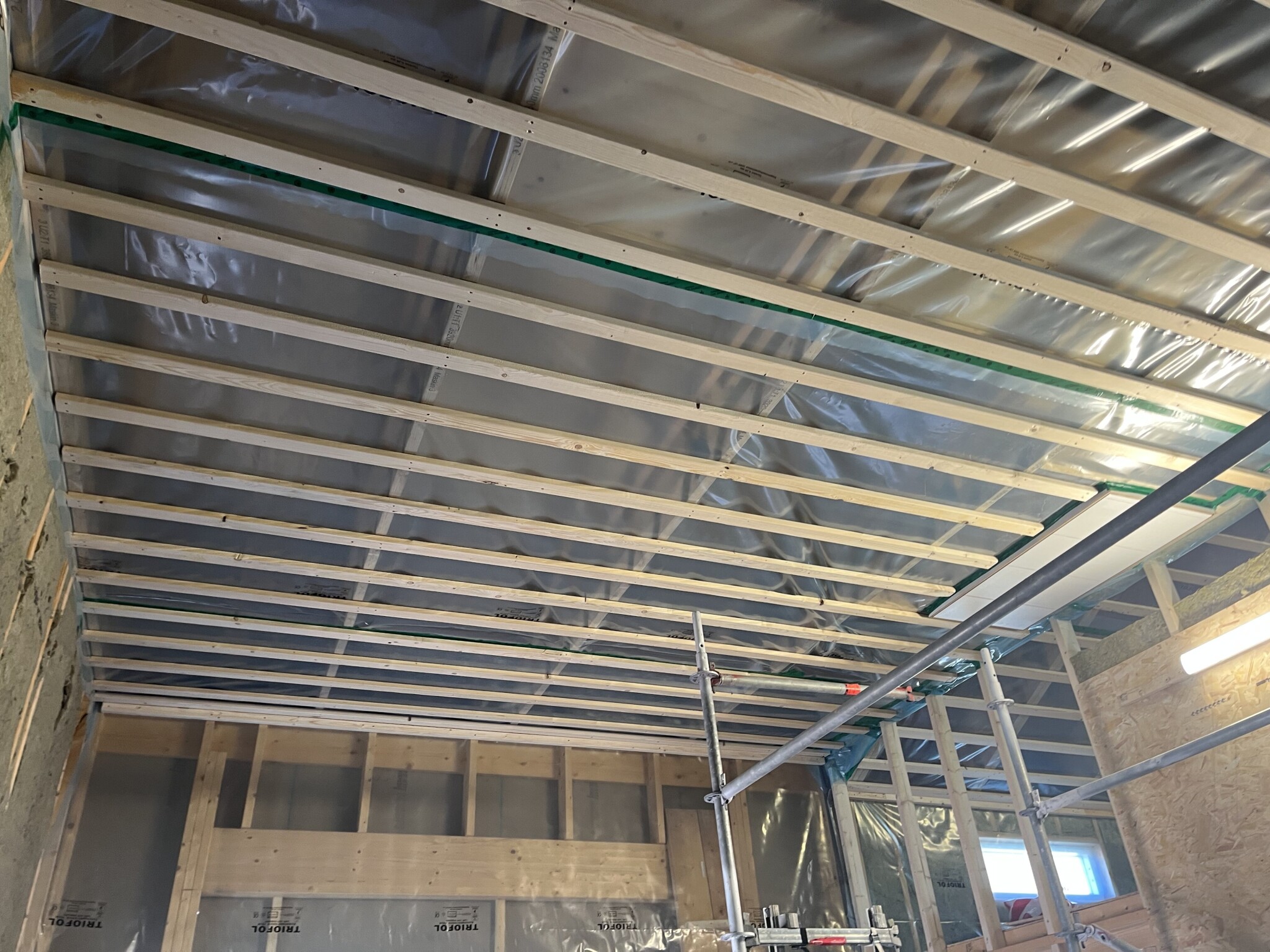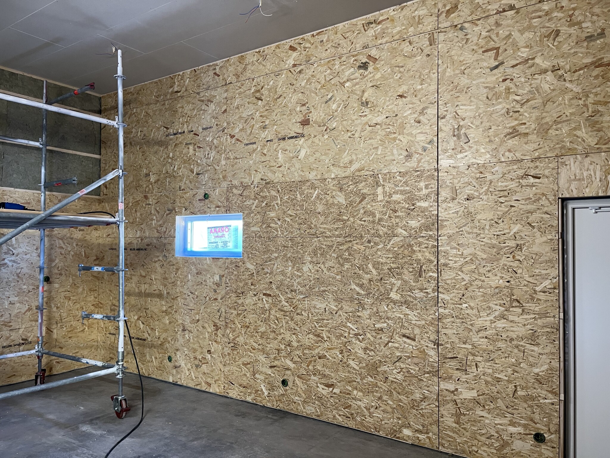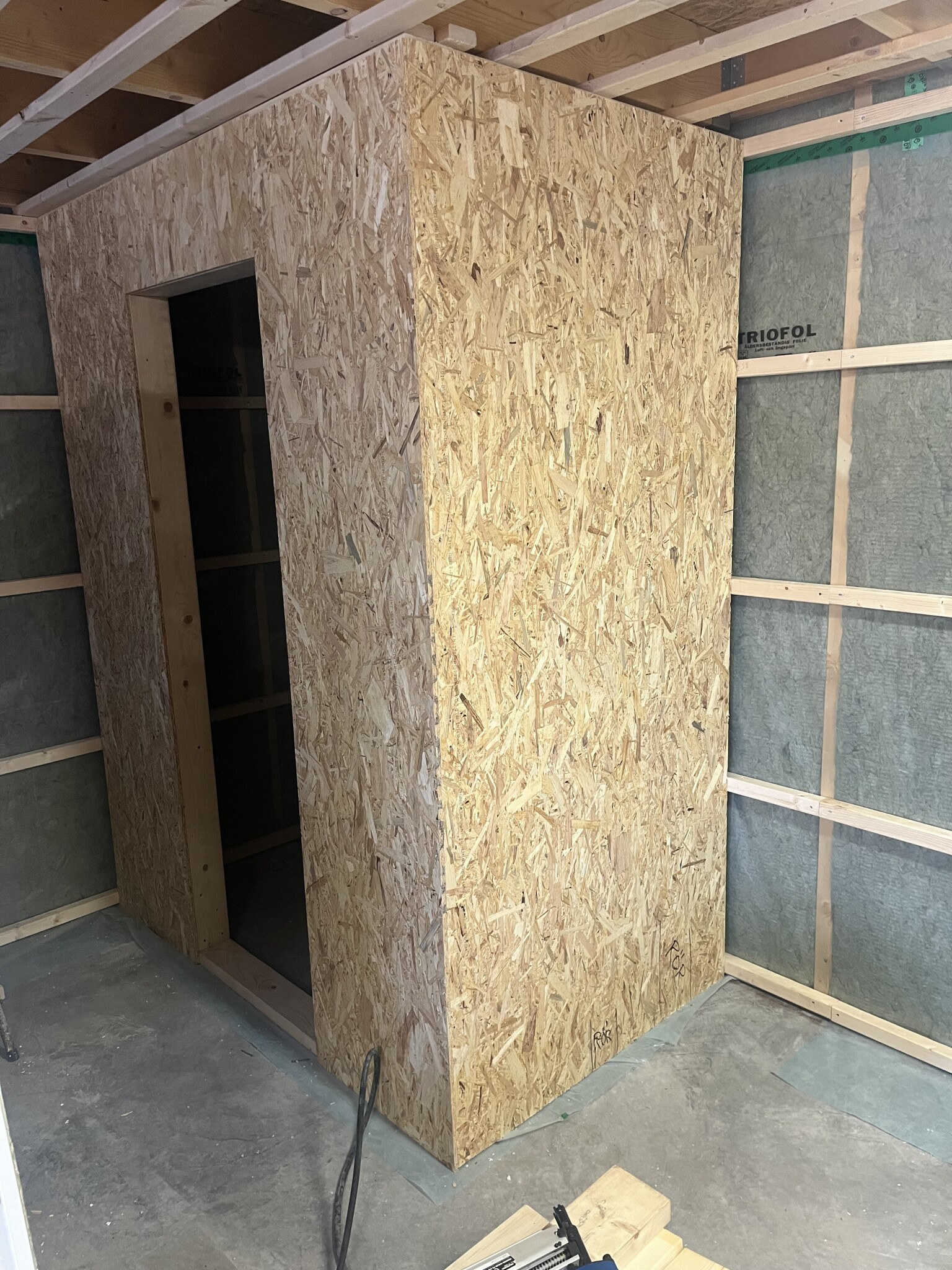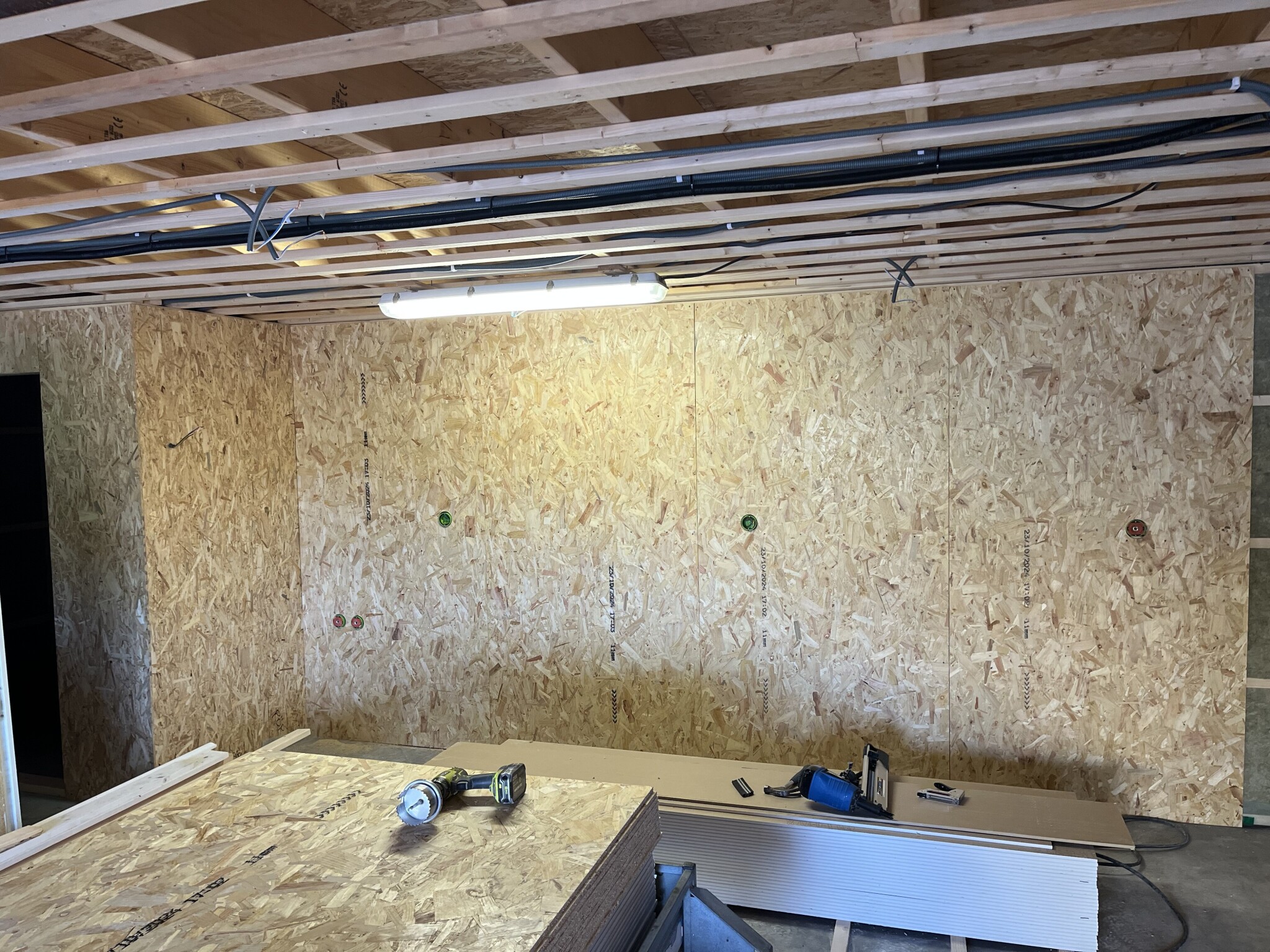 Fortsättning även i lågdelen, osb på väggar samt gips i taket. Först ett lager vanlig med spackel och sedan 240-plank.🙂
