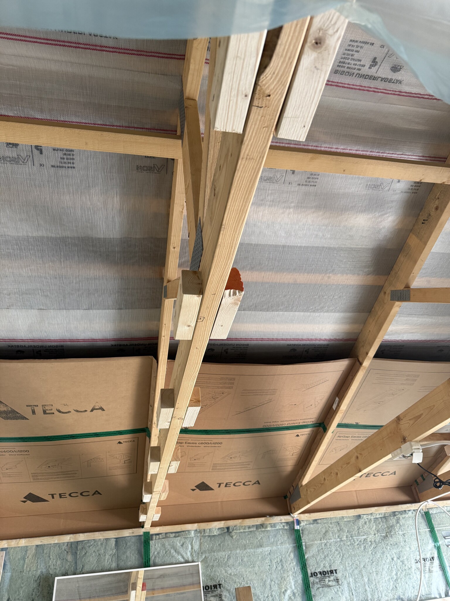Valde att ha skarven för glespanelen på takstolarna istället för "i luften" Men de är rätt smala och jag har justerbar skruv, så har fått sätta lite stöd bitar för att kunna fästa bättre.