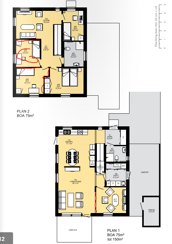 Röda väggar hade vi tänkt att isolera om vi gör det själva och G står för garderob (Där behöver vi förmodligen inte isolera (därav spannet 3-5 väggar)