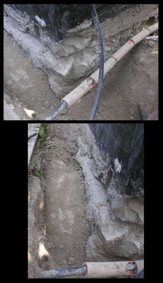 Har provgrävt där fukten är som värst (vid ett stuprör).